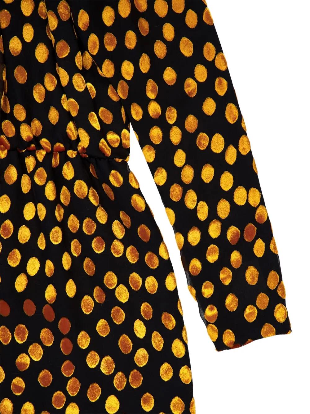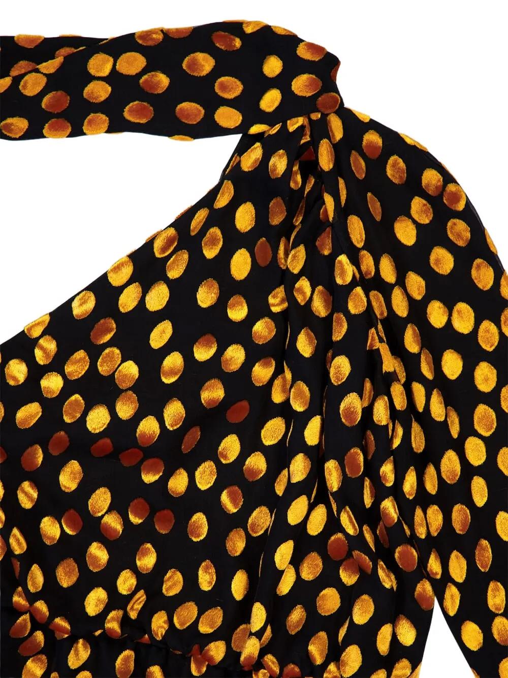 black gold polka-dot pattern one-shoulder neckline long sleeve elasticated waist mousseline fabric