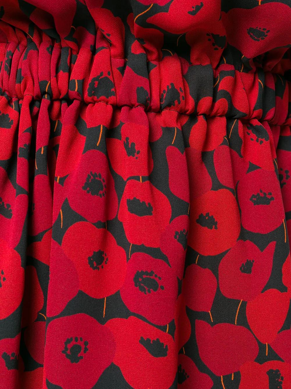 With a legacy built on luxurious hedonism, Parisian fashion house Saint Laurent exudes the seditious spirit of the times through classic tailored silhouettes which exude the grit and glamour of punk rock. This red silk poppy print dress from Saint Laurent's latest collection is a signature piece, featuring an off the shoulder design, an elasticated waistband, billowing sleeves, a short length, elasticated cuffs and a lightweight construction.