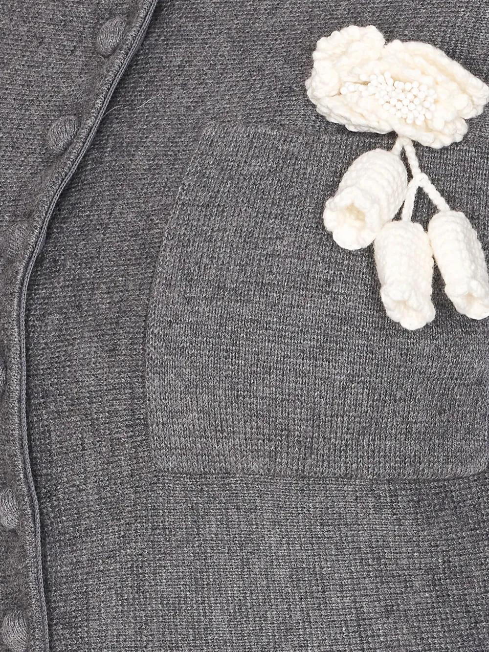 grey crochet flower embellishment collared neckline button front fastening long sleeves patch pockets