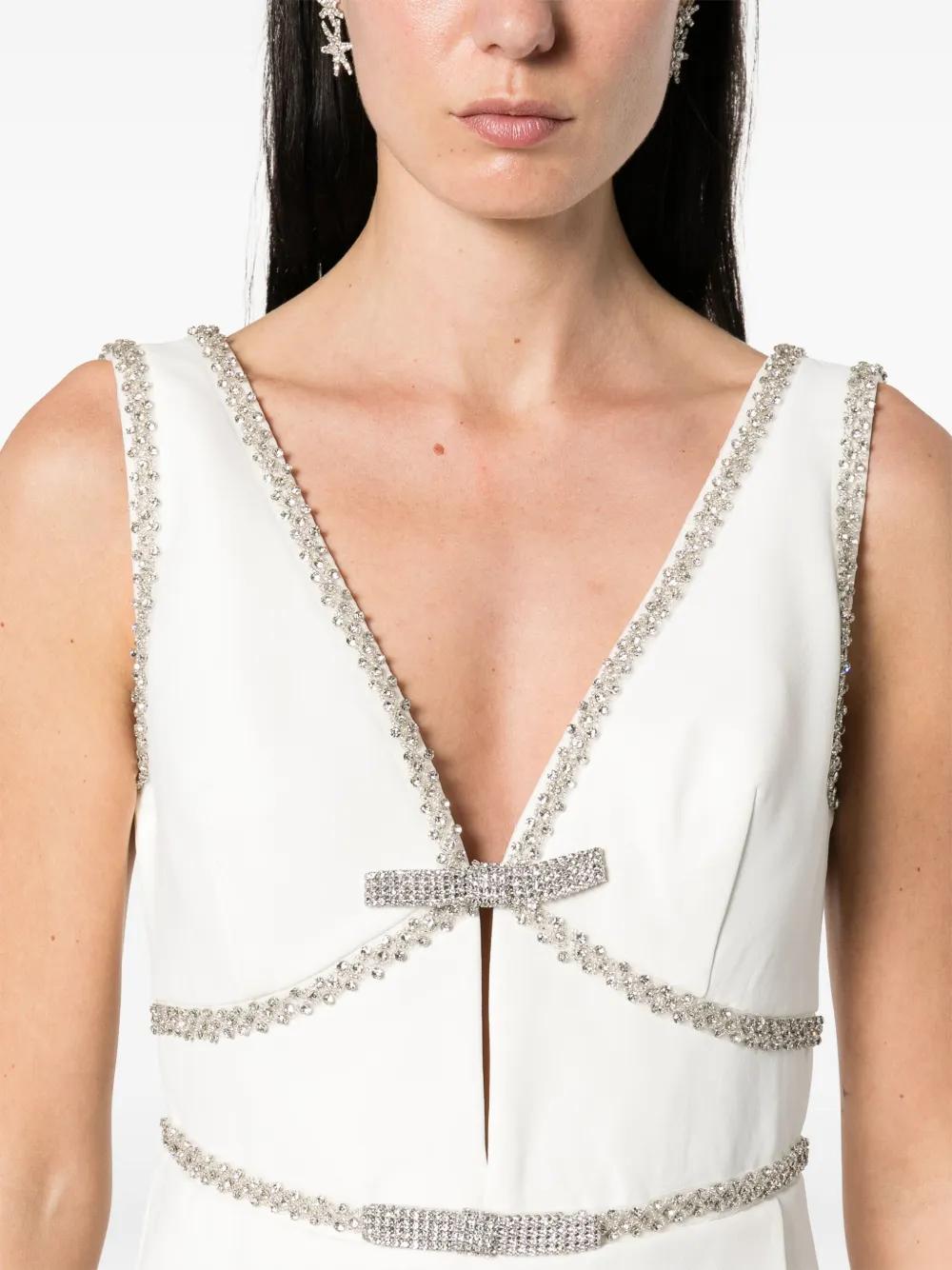 optical white crepe texture crystal embellishment V-neck sleeveless cut-out detailing bow detailing front slit V-back straight hem full lining concealed rear zip fastening