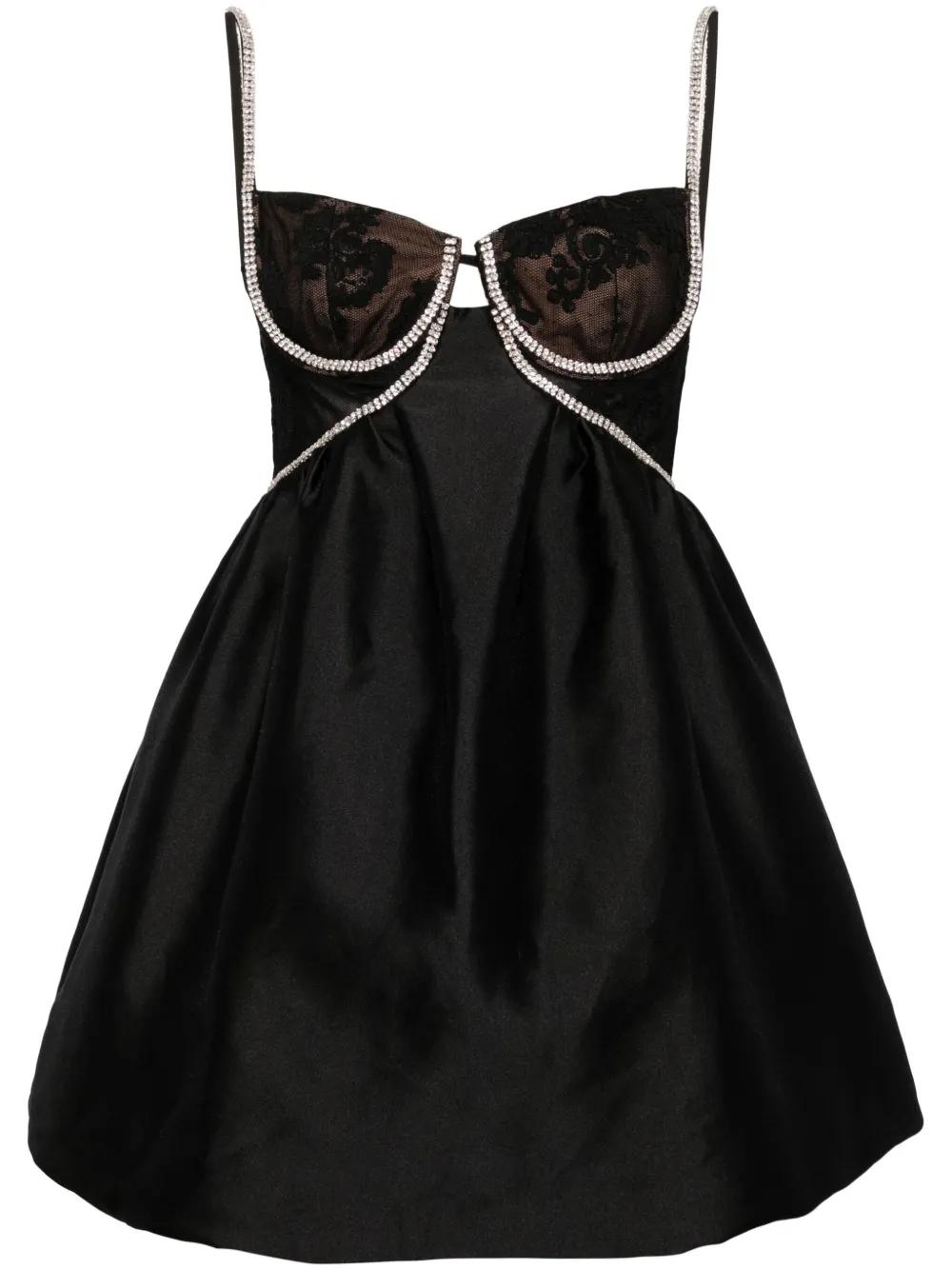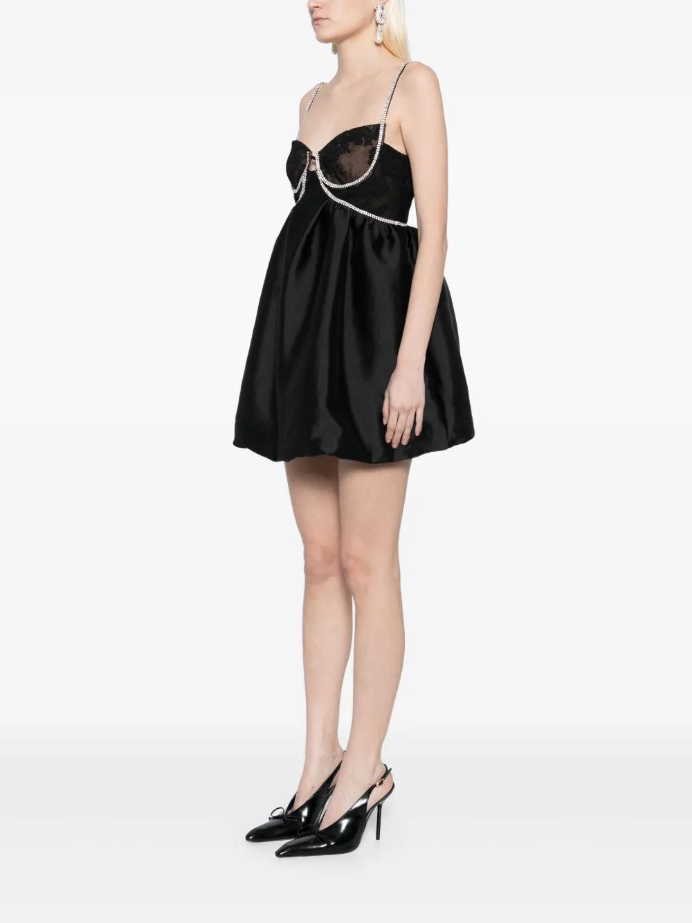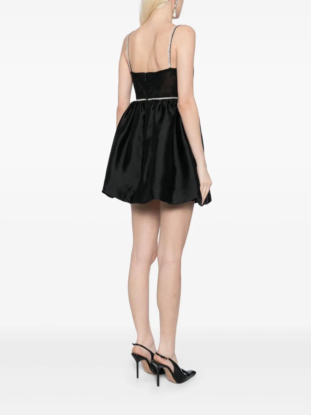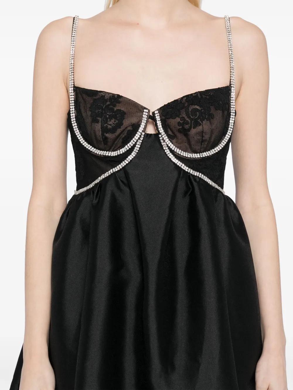 black taffeta crystal embellishment concealed rear hook and zip fastening spaghetti straps bustier-style neckline lace panelling boned bodice fitted waistline two side inset pockets puffball hem full lining