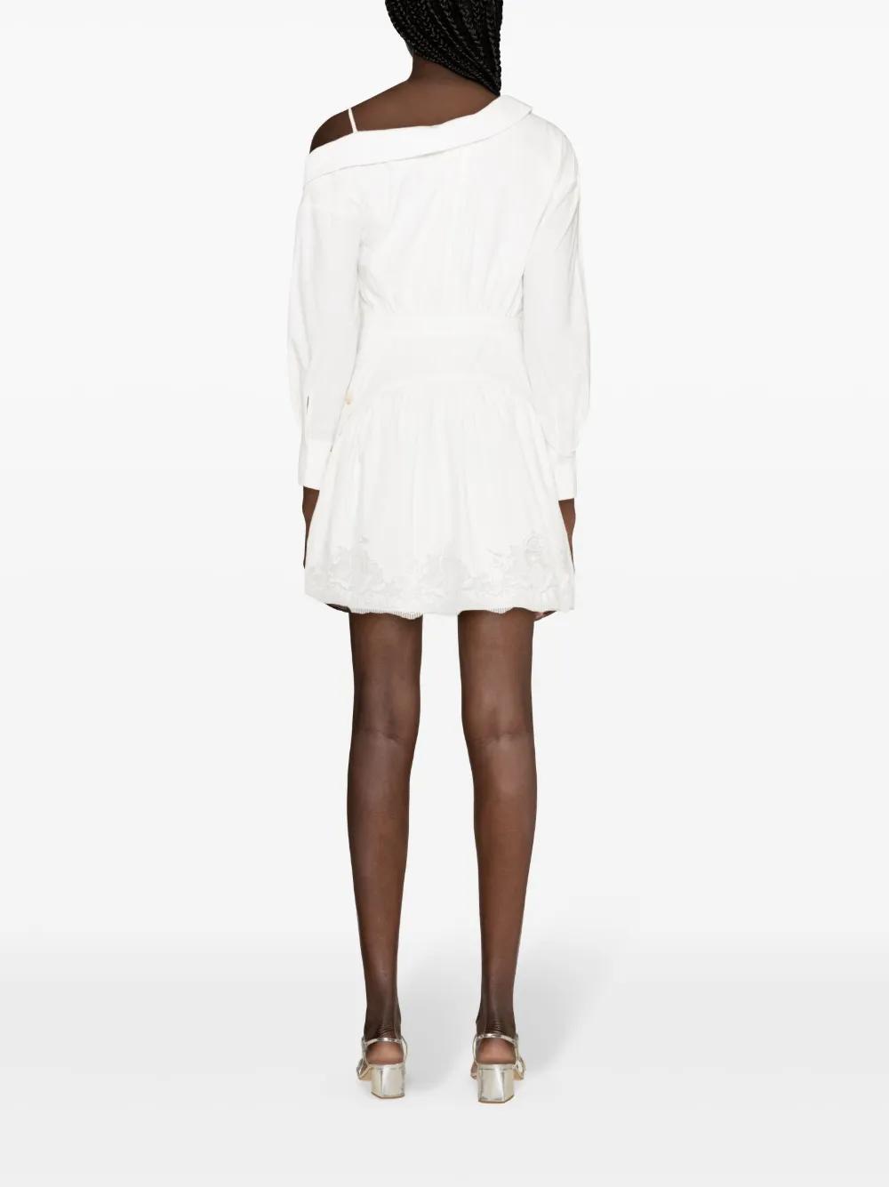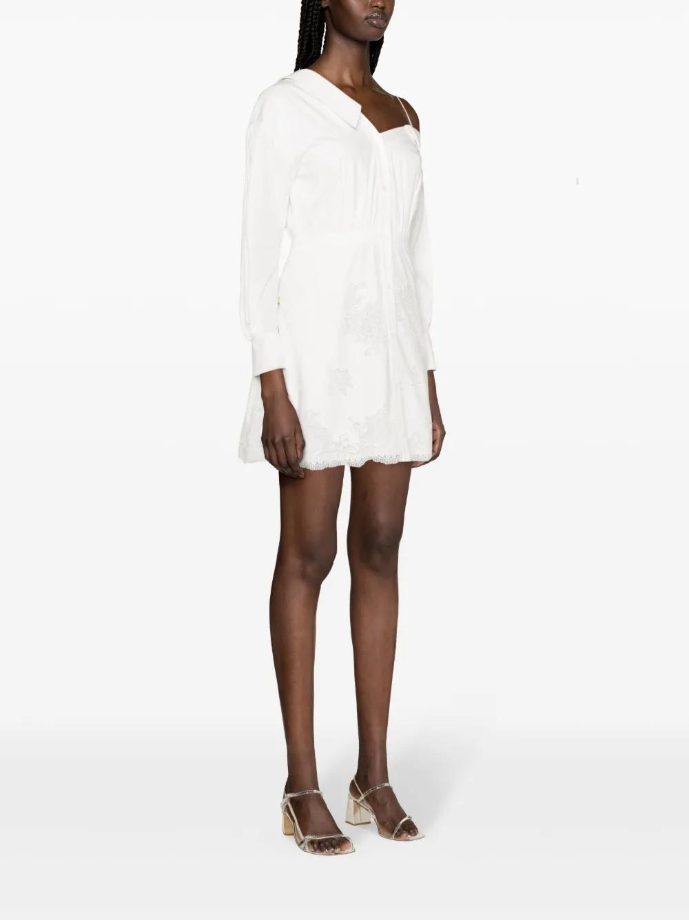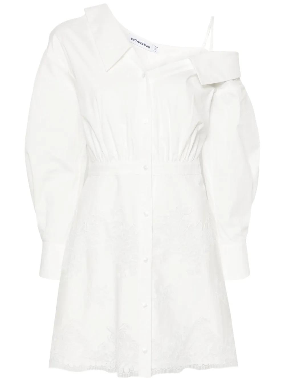 white cotton floral lace appliqué off-shoulder classic collar adjustable spaghetti straps front button fastening long sleeves buttoned cuffs fitted waistline side button fastening flared skirt lace trim thigh-length cotton lining