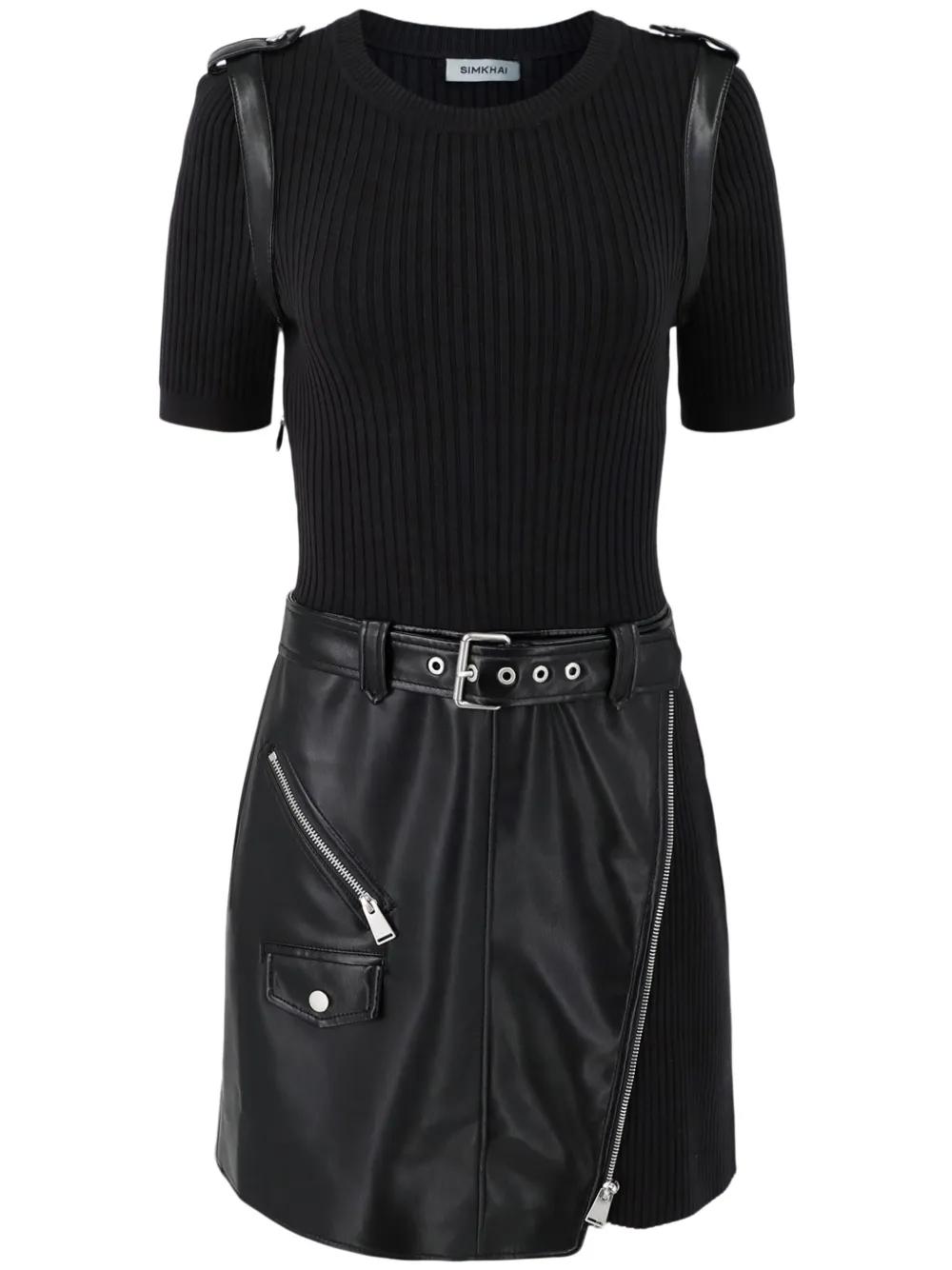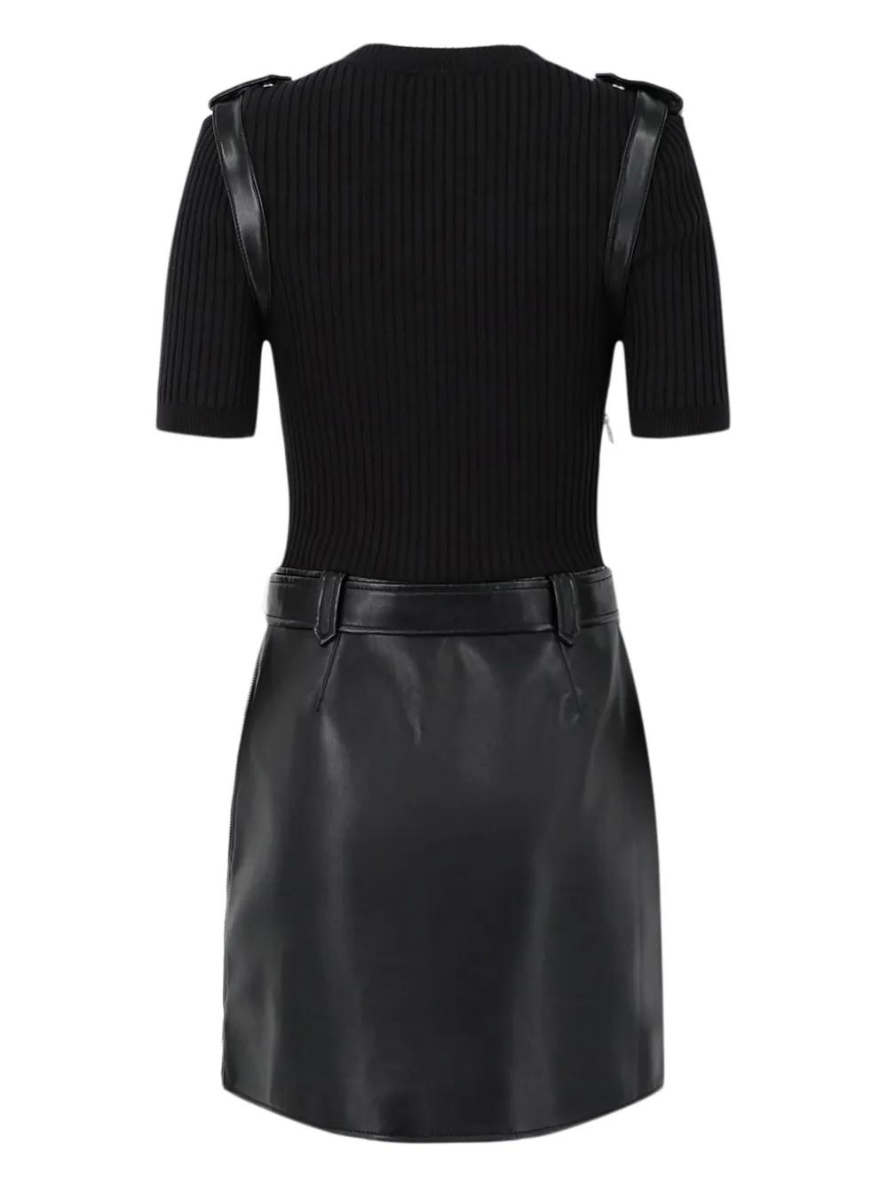 black faux leather ribbed knit panelled design crew neck concealed side zip fastening belted waist front zip fastening short sleeves A-line skirt silver-tone hardware front zip-fastening pocket front flap pocket asymmetric hem above-knee length