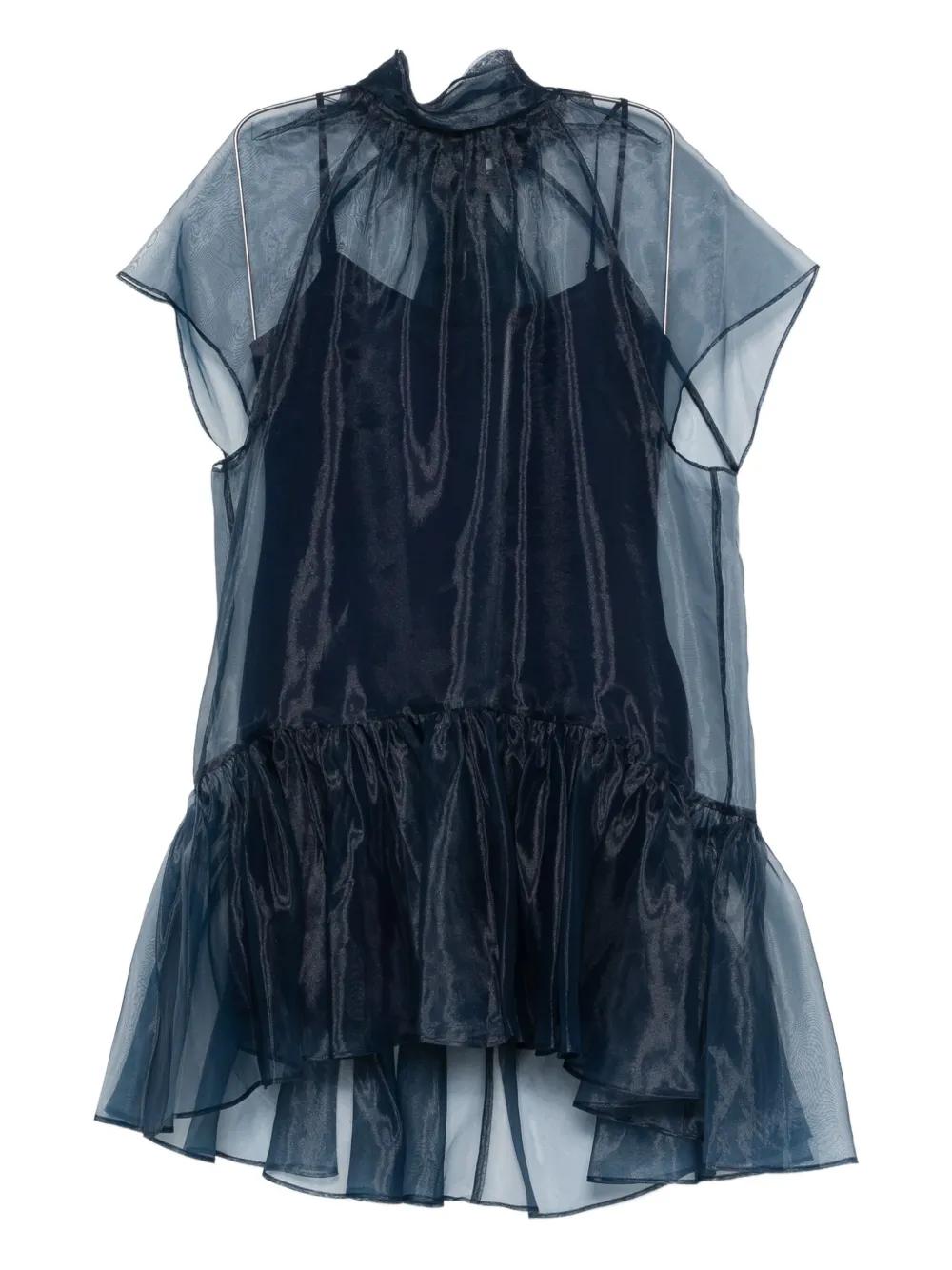 blue ruffled detailing high neck short sleeves tiered hem sheer overlay
