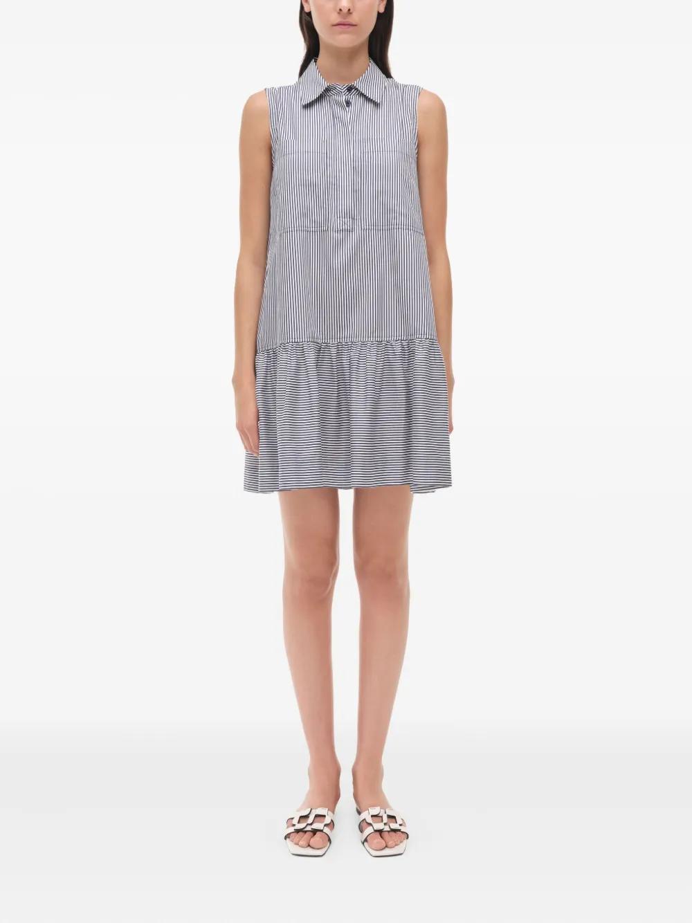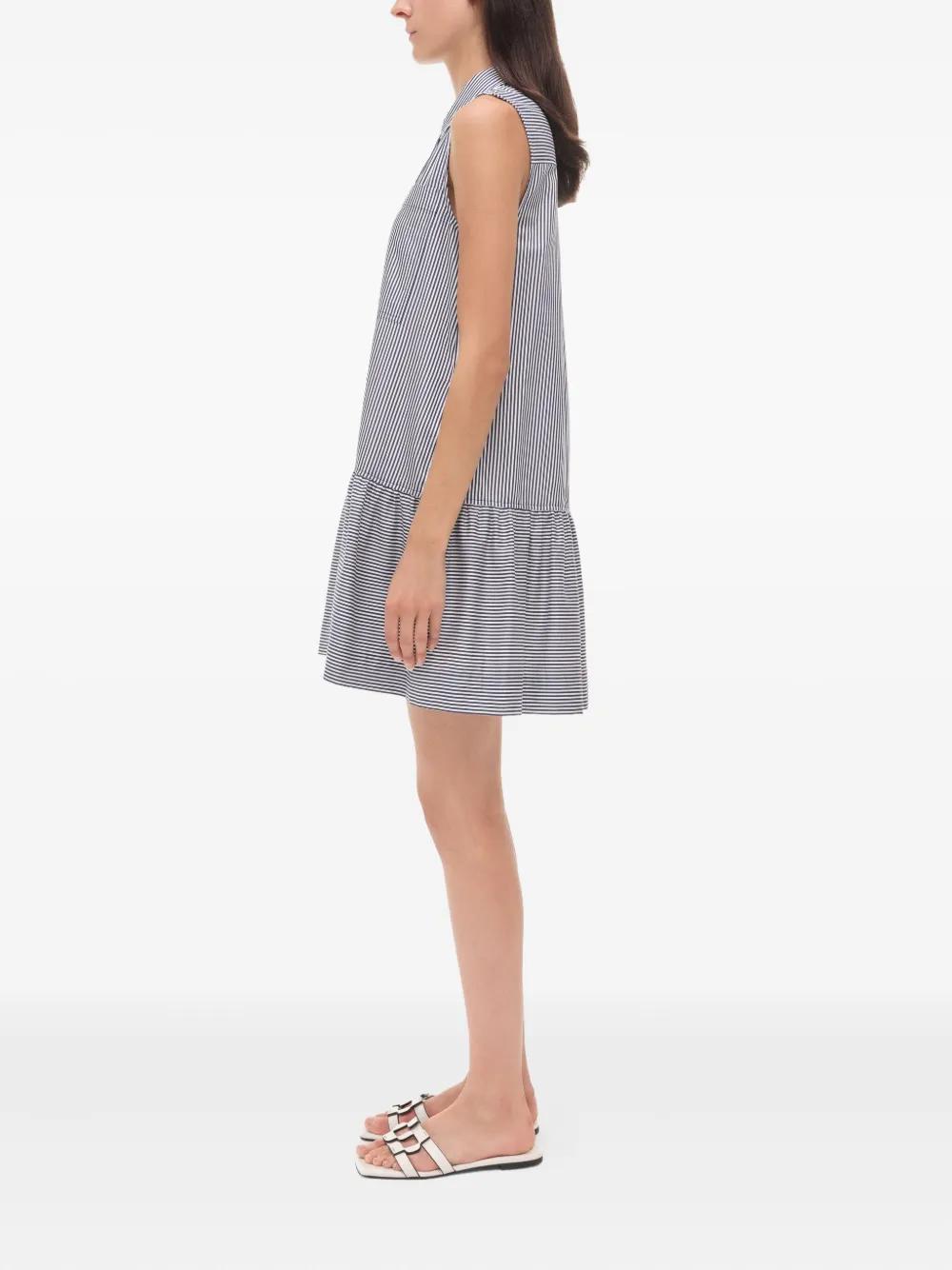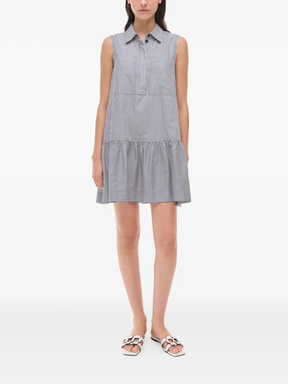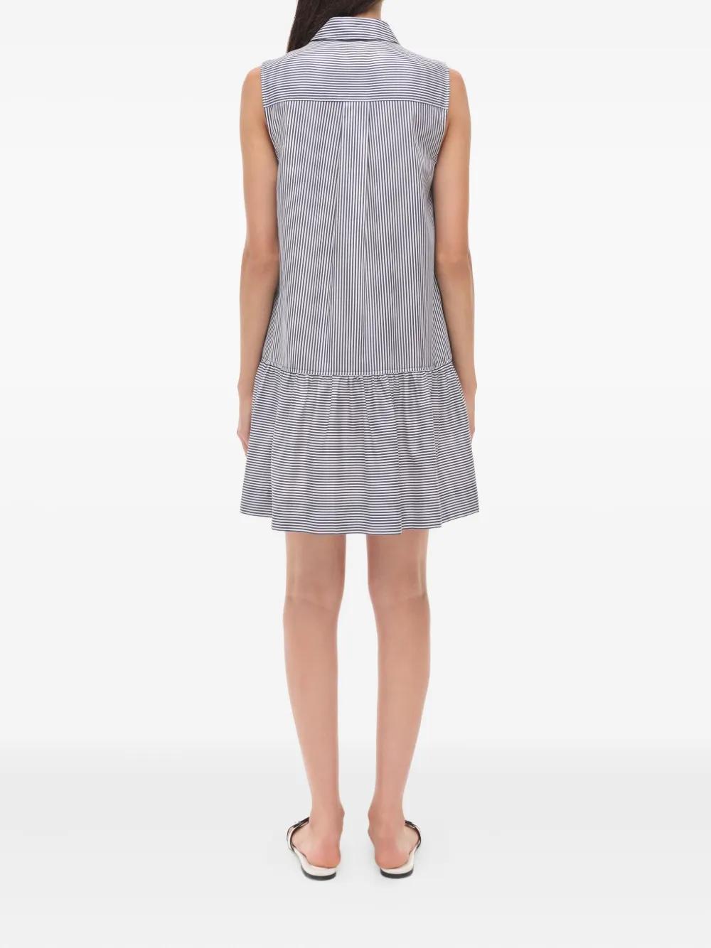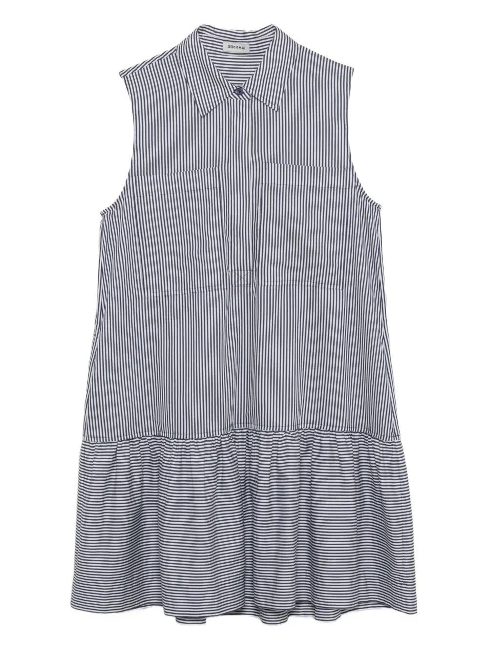 midnight blue white stripes collared neckline button front fastening sleeveless design tiered skirt