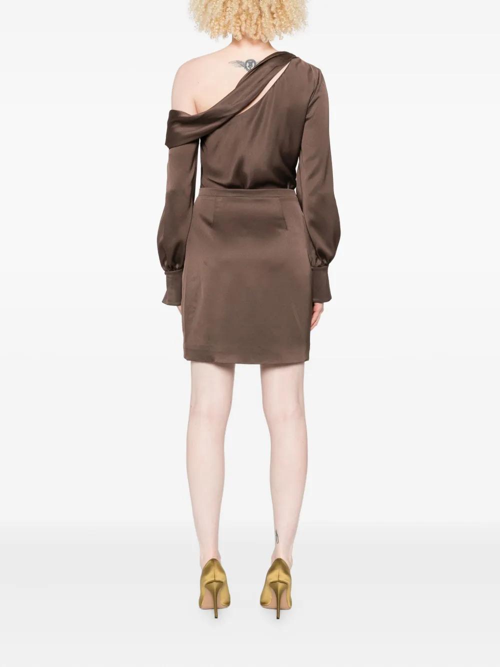 brown one-shoulder neckline wrap skirt long sleeve cuffed sleeve