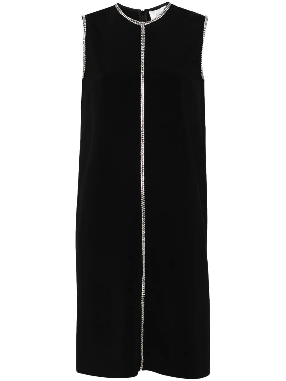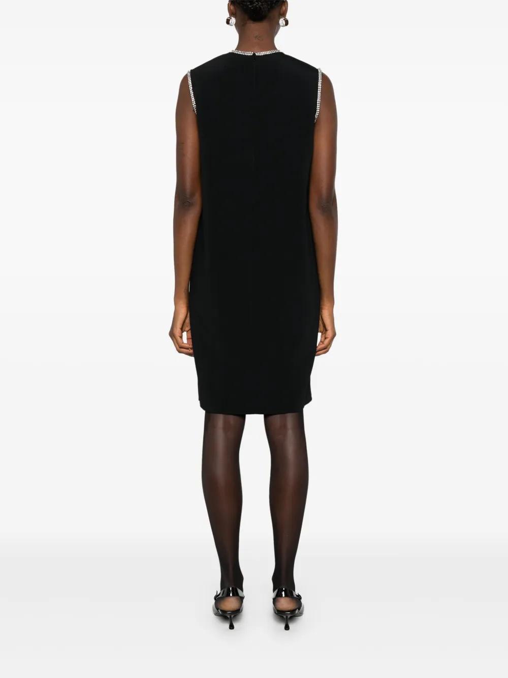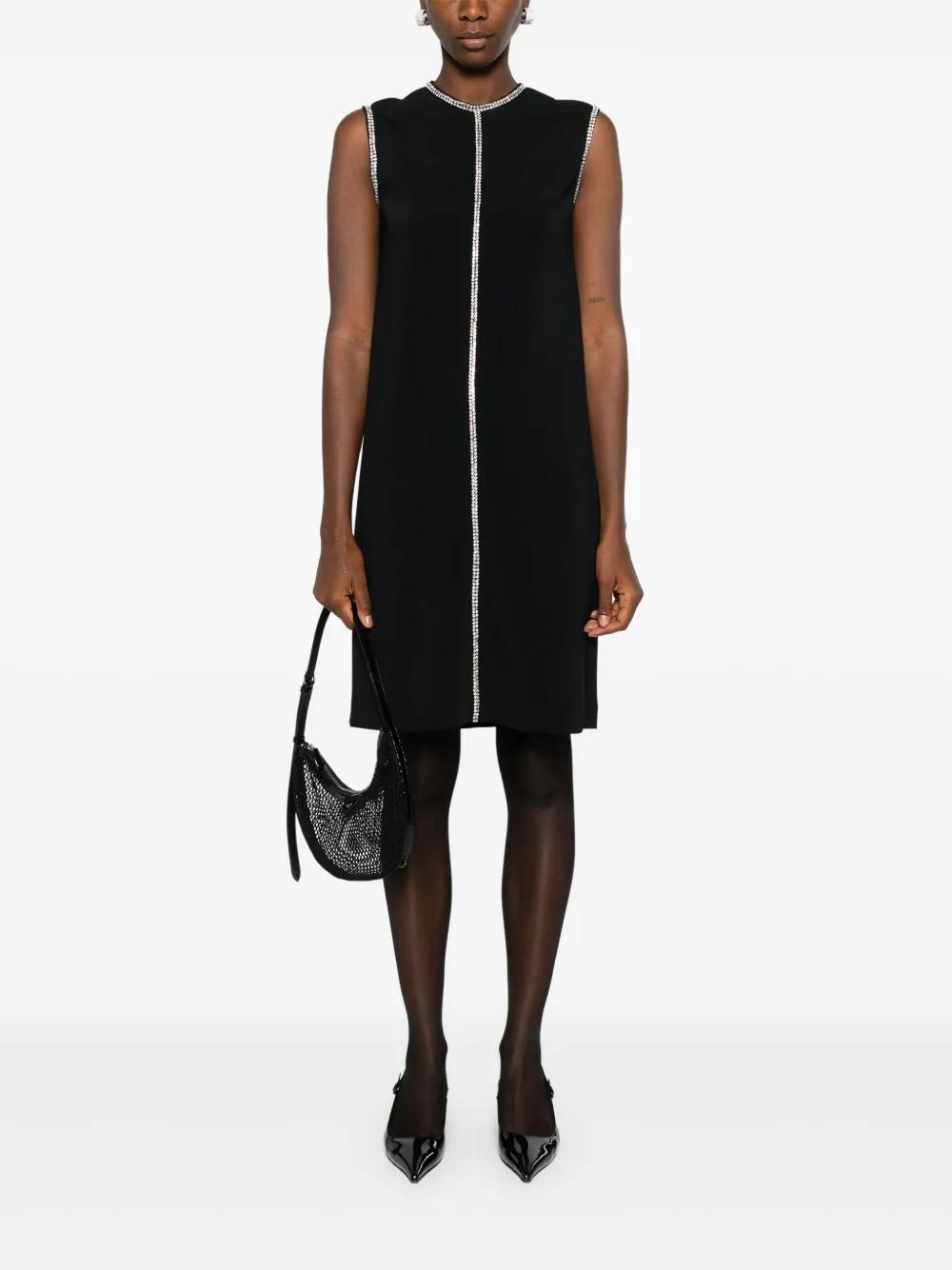 black crepe texture crystal embellishment concealed rear hook and zip fastening round neck sleeveless side slit straight hem above-knee length