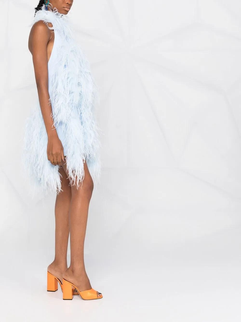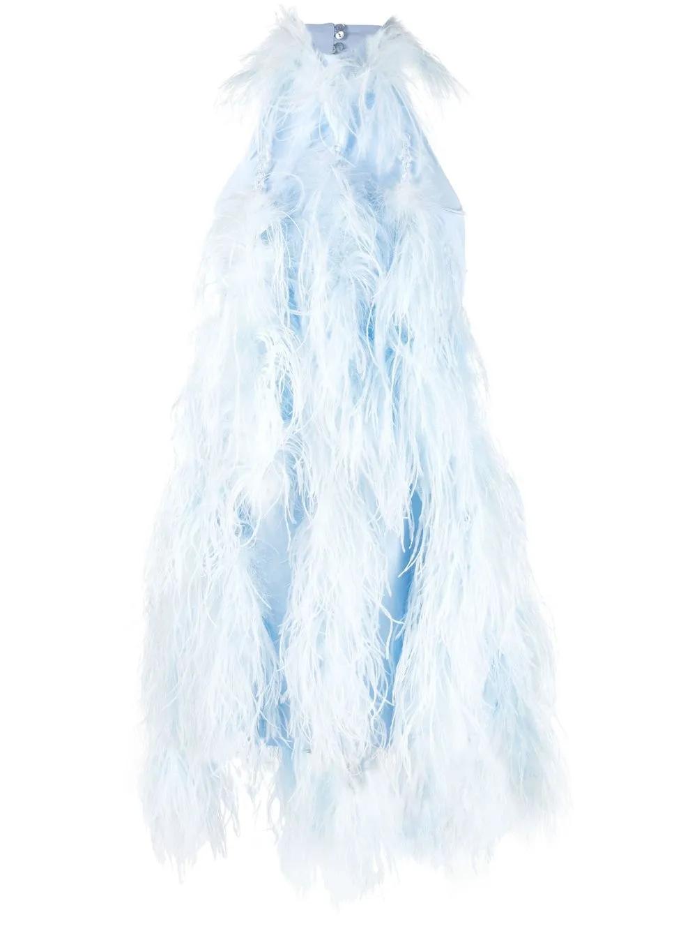 ice blue feather detailing halterneck sleeveless open back asymmetric hem
