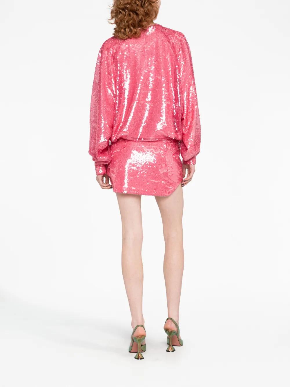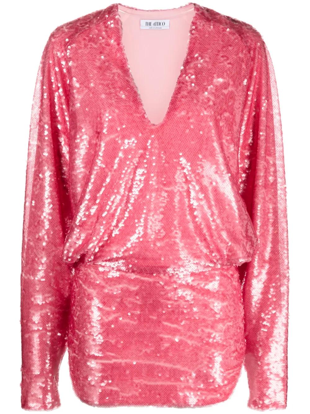 coral pink sequin design draped detailing V-neck long sleeves buttoned cuffs fitted waistline concealed side zip fastening curved hem