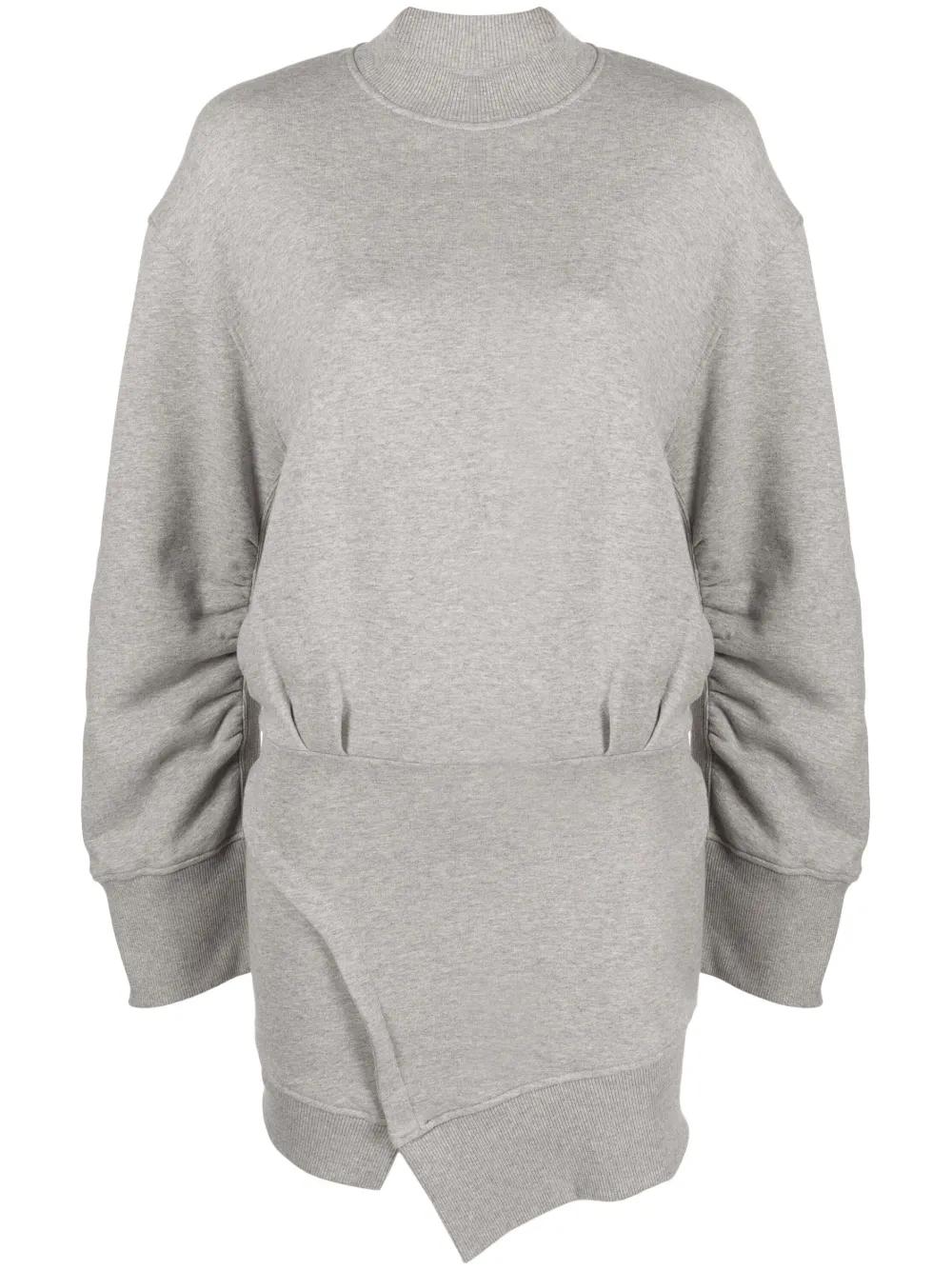 light grey cotton jersey fleece mélange effect gathered detailing crew neck drop shoulder long sleeves asymmetric hem