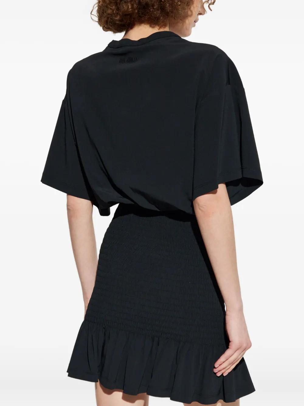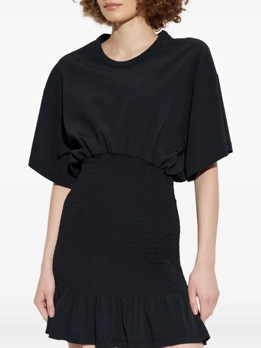 black smocked bodice ruffled hem short sleeves round neck straight hem