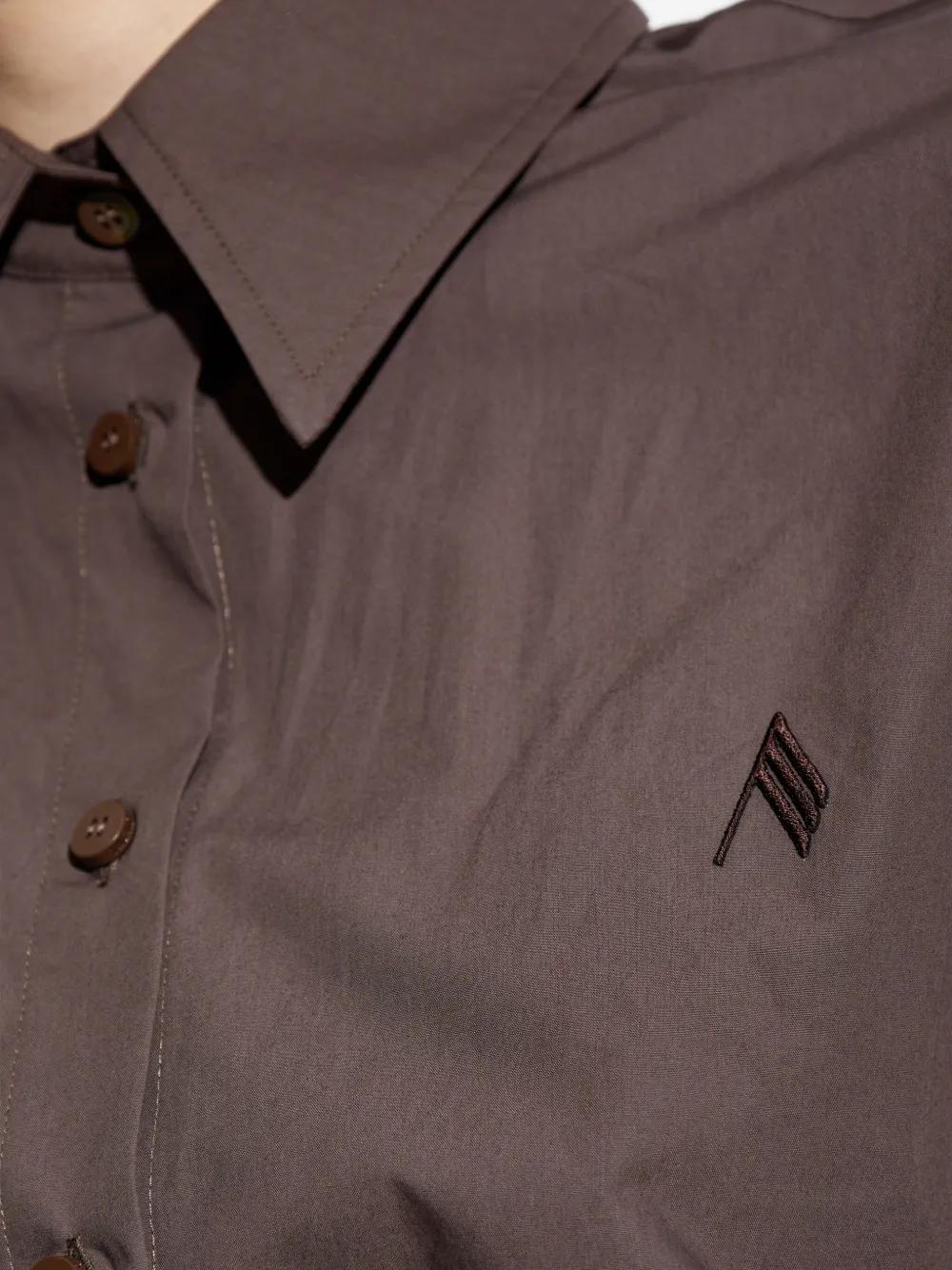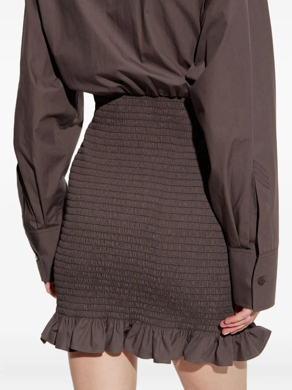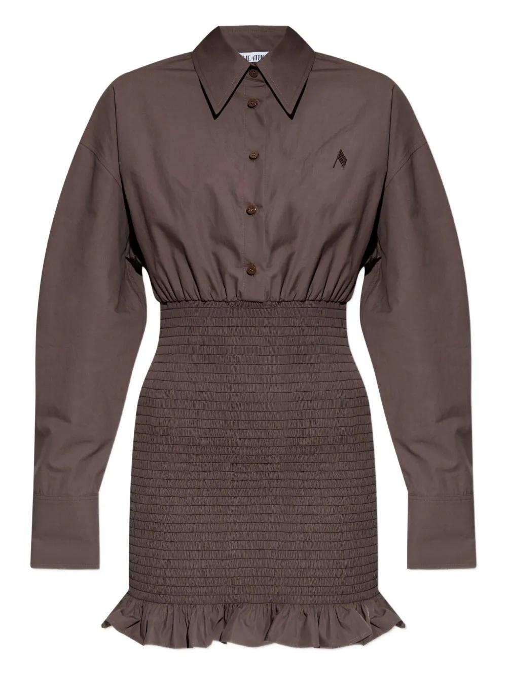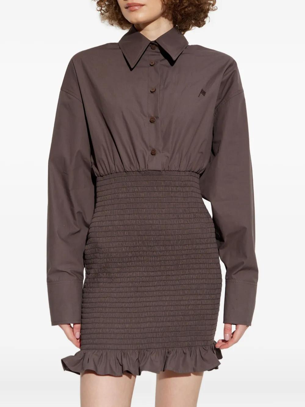 brown smocked design ruffled hem shirt collar long sleeves button fastening