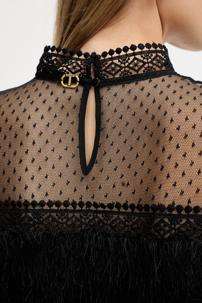 - Model o długości mini. - Koronkowa wstawka. - Z tyłu zapięcie na guzik. - Model na podszewce. - Model z frędzlami. - Długość: 86 cm. - Szerokość pod pachami: 42 cm. - Wymiary podane dla rozmiaru: 36.
