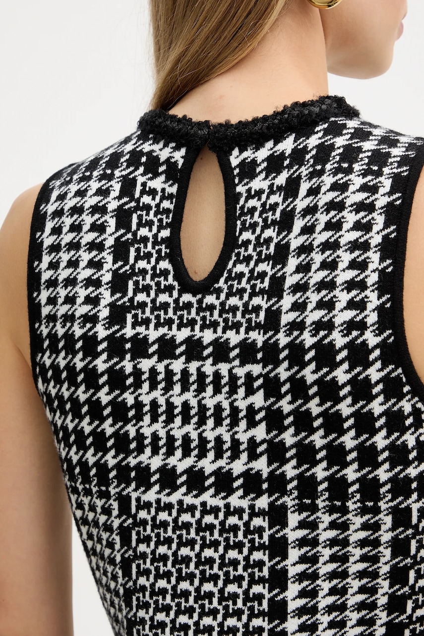 - Dopasowany, podkreślający sylwetkę fason. - Klasyczny, okrągły dekolt. - Dekolt zapinany na haftkę. - Imitacja kieszeni z przodu. - Długość sukienki: 86 cm. - Szerokość pod pachami: 42 cm. - Wymiary podane dla rozmiaru: S.