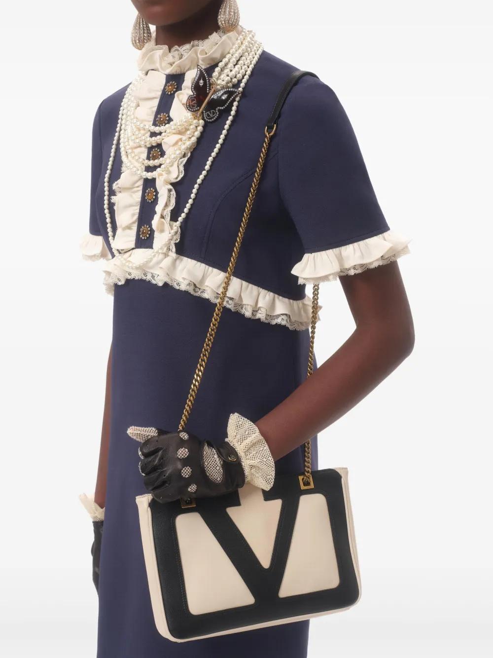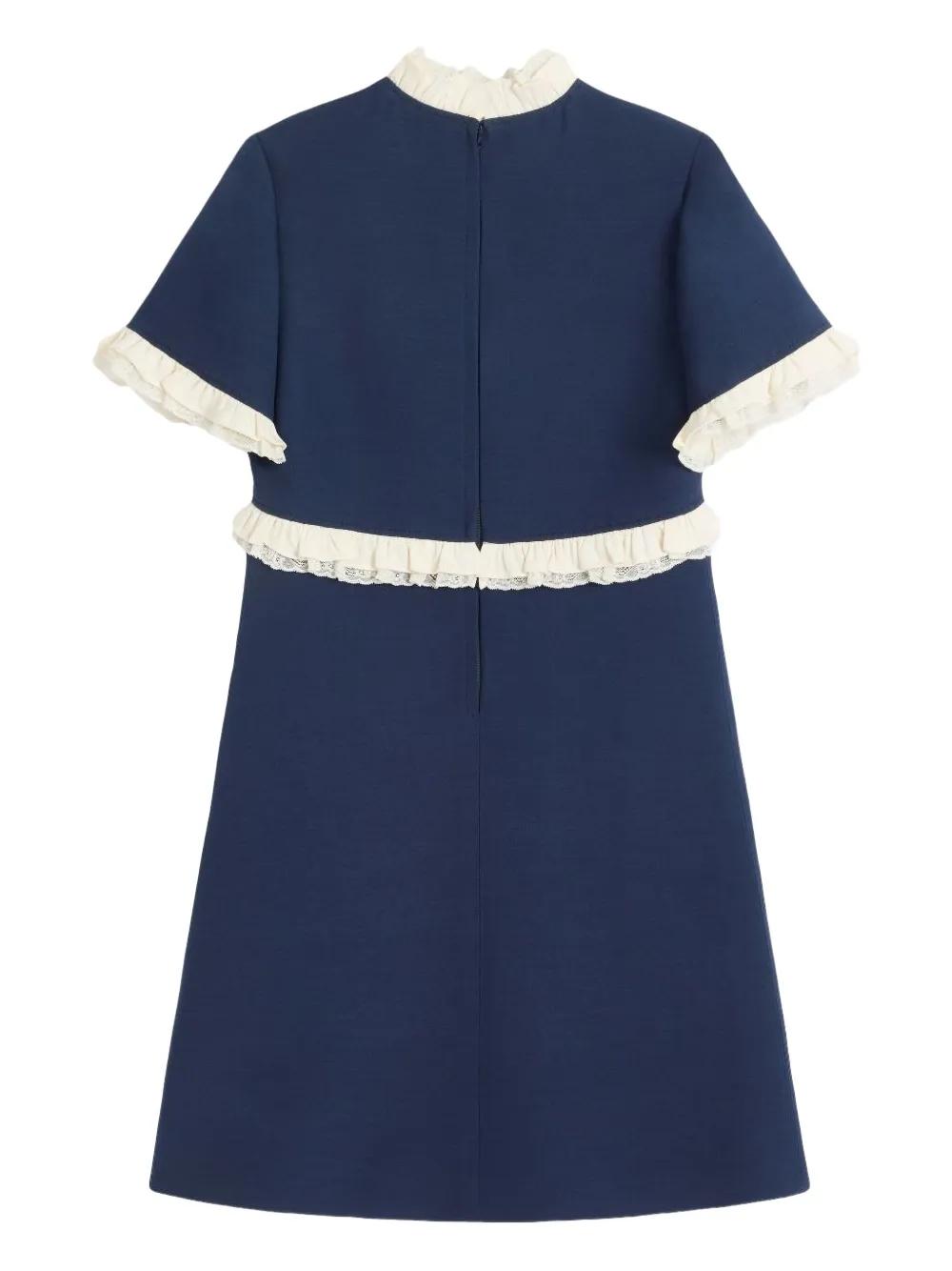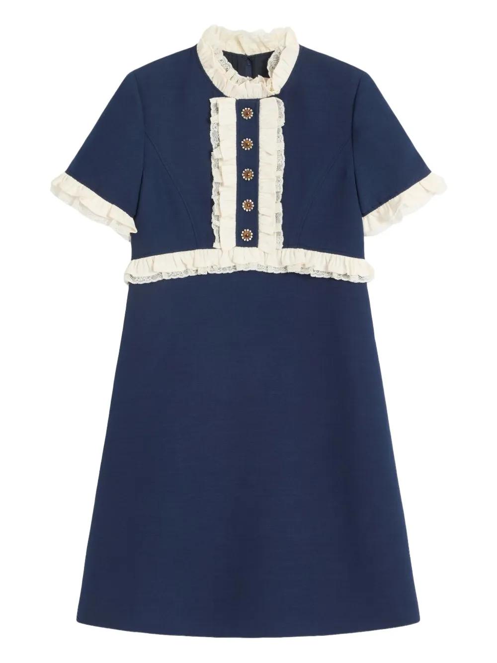 navy blue concealed rear zip fastening mock neck decorative button detailing lace trim