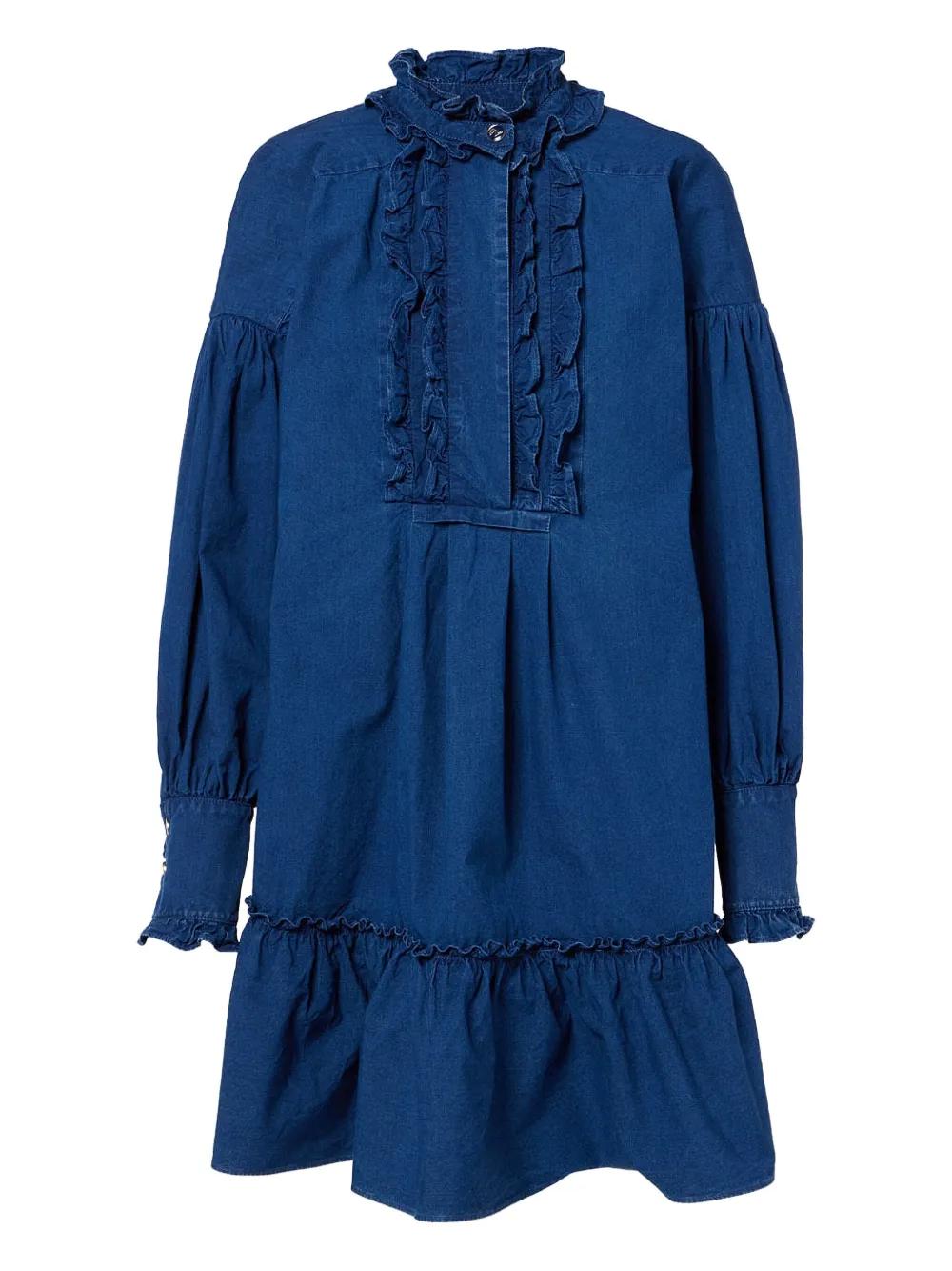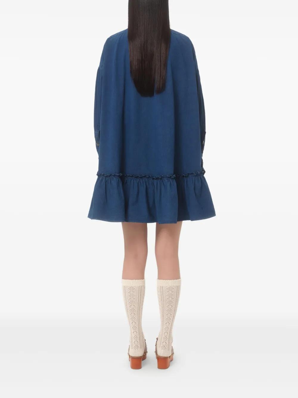 navy blue front button placket long puff sleeves buttoned cuffs ruffled detailing