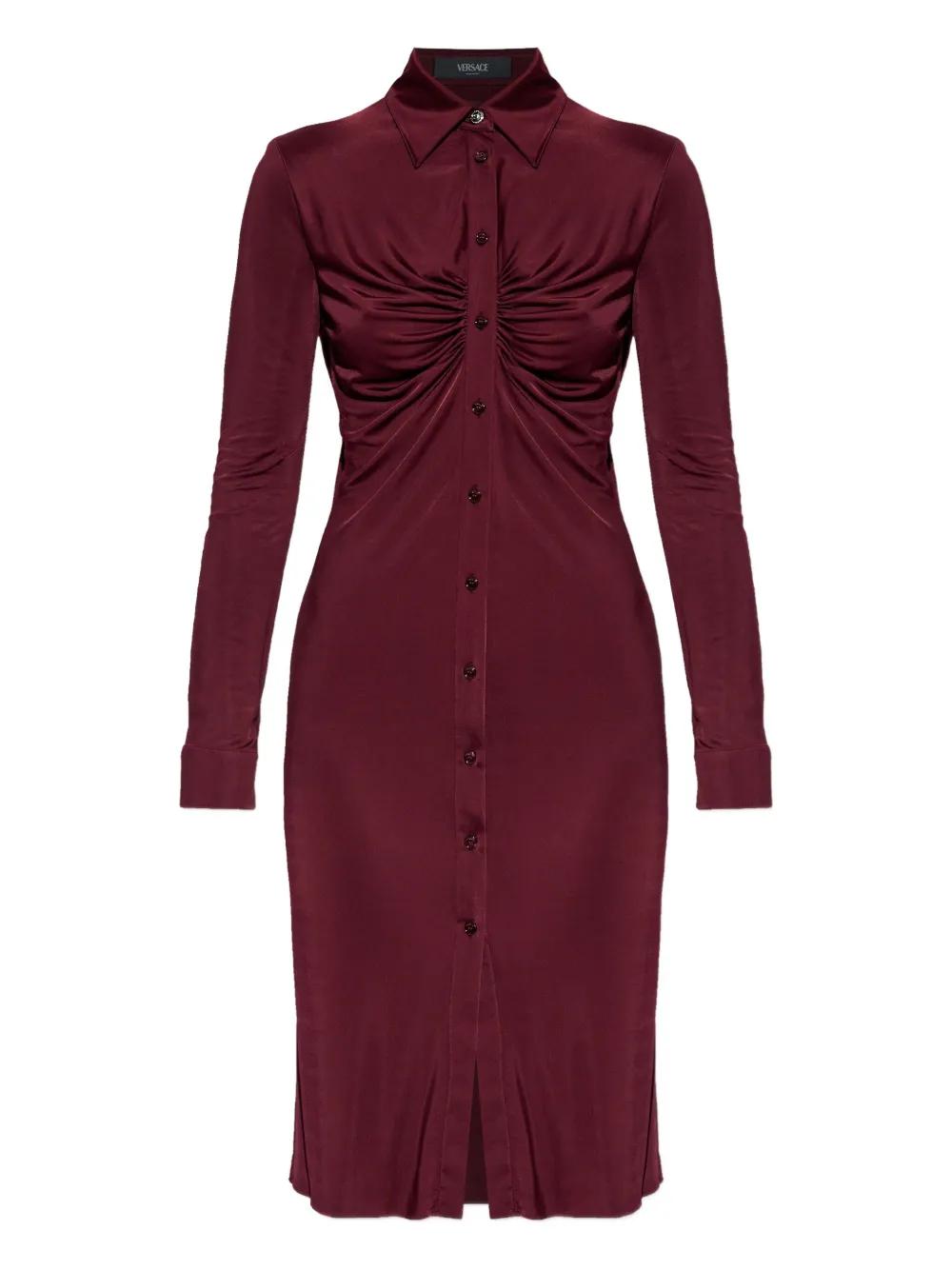 burgundy button fastening gathered detailing long sleeves point collar