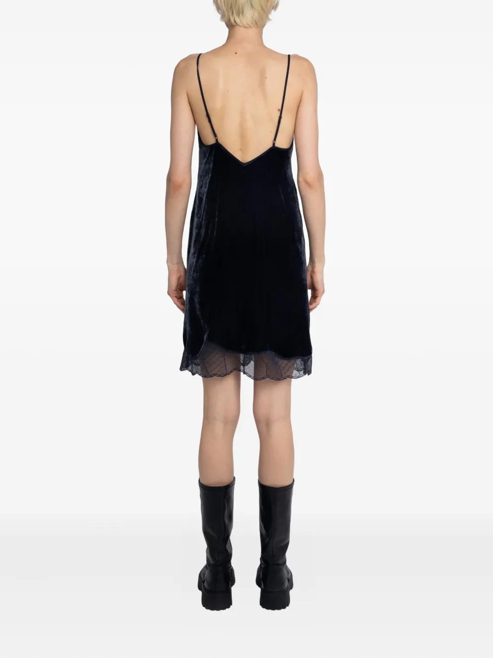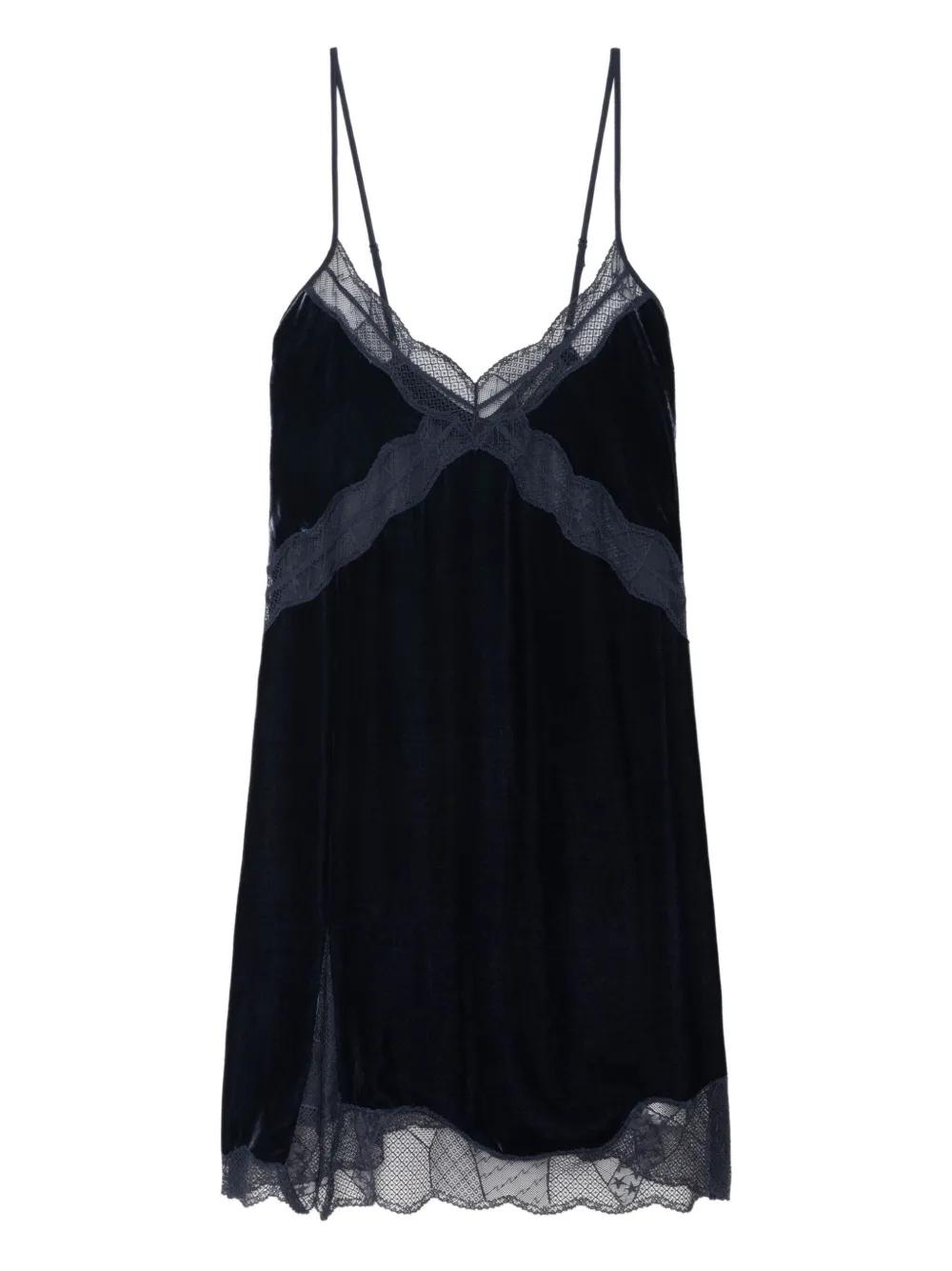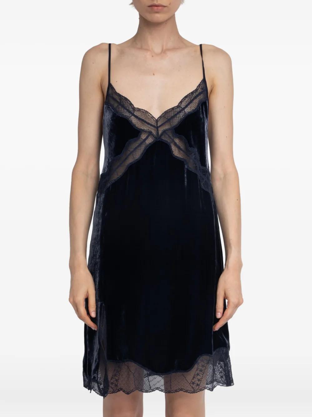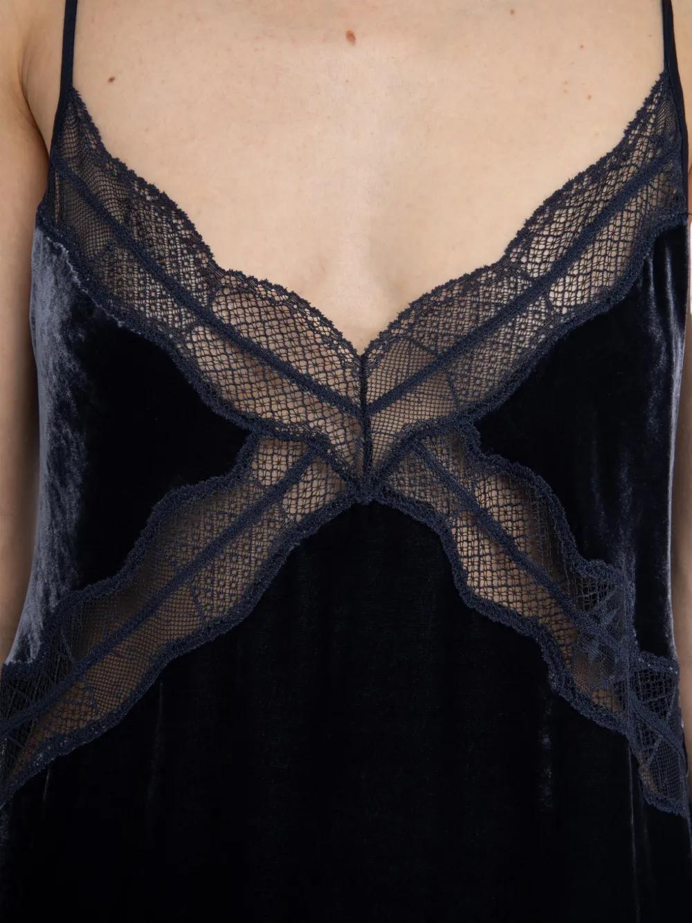 navy velvet lace trim spaghetti straps v-neck straight hem