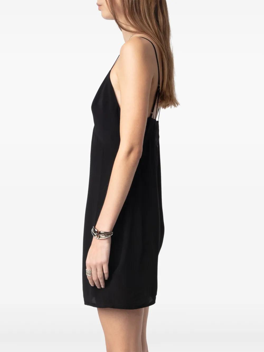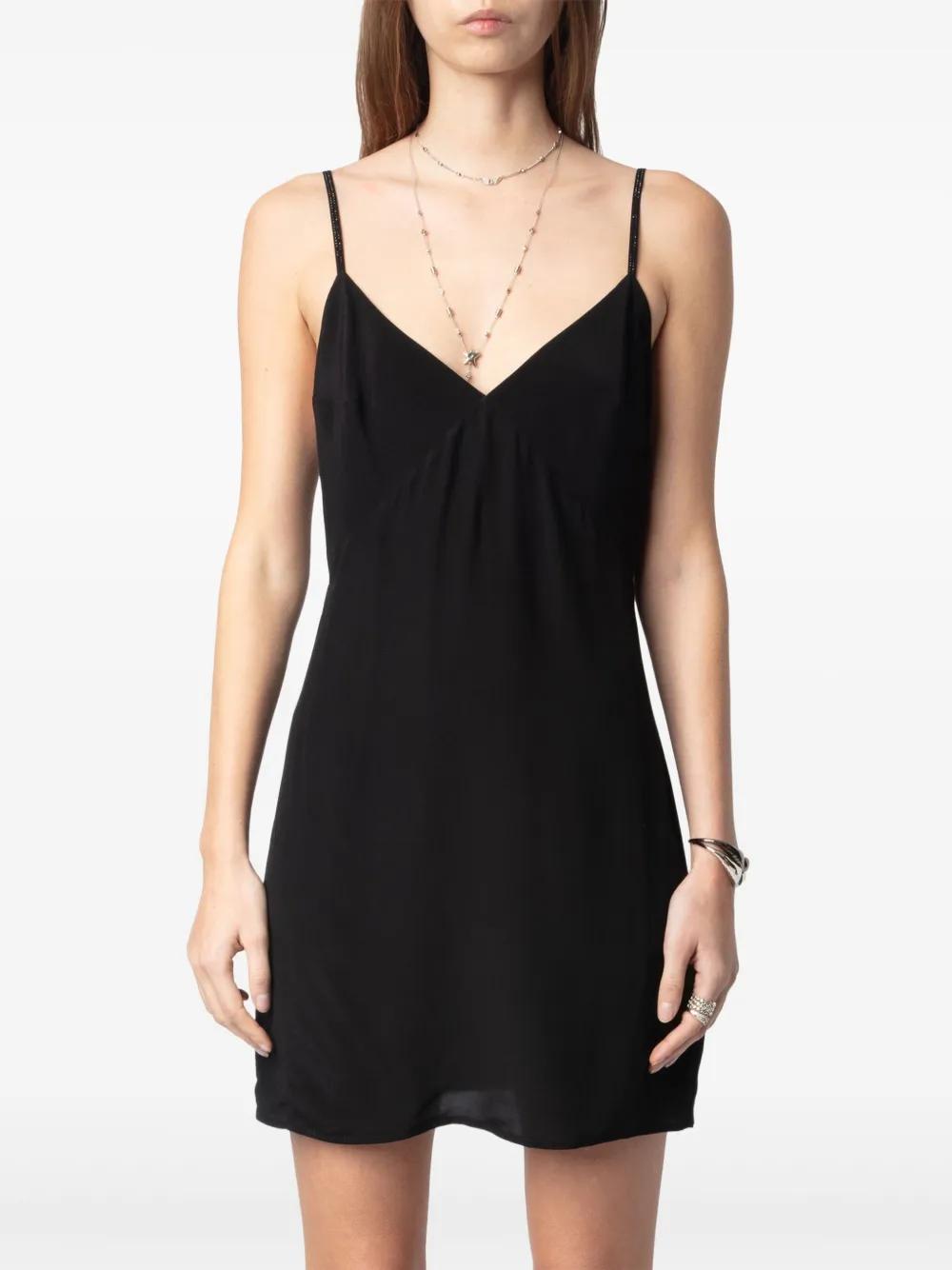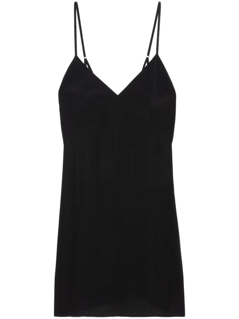 black V-neck adjustable spaghetti straps rhinestone embellishment embroidered logo to the rear