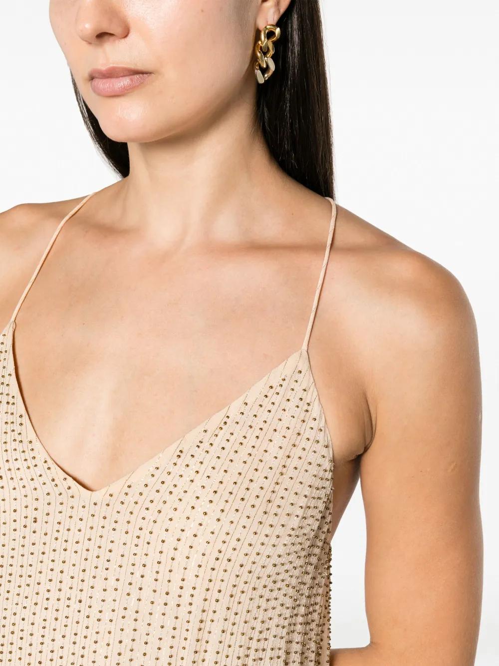 light beige rhinestone embellishment V-neck spaghetti straps rear criss-cross straps thigh-length straight hem