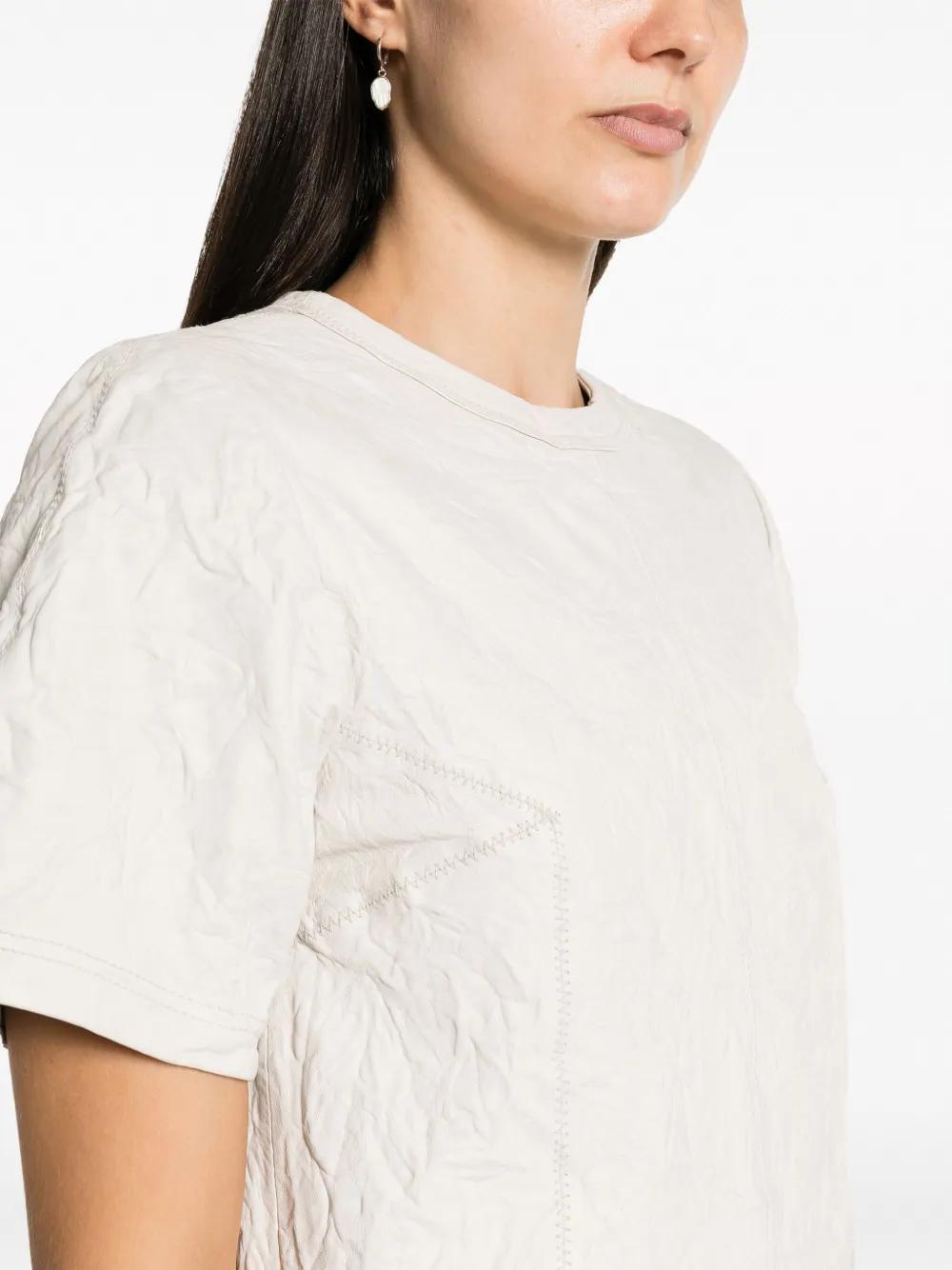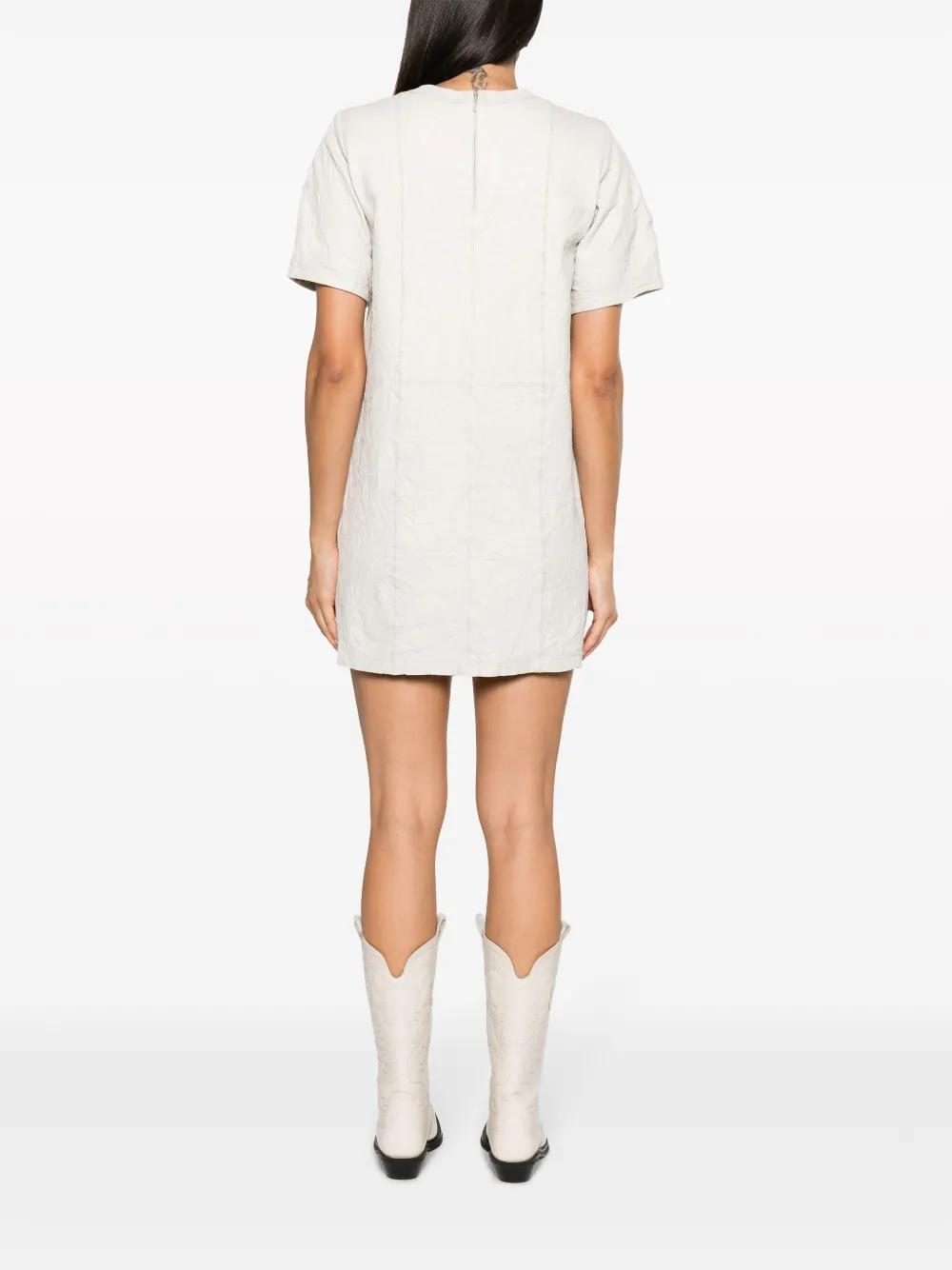 ecru lambskin cotton crinkled finish round neck rear zip fastening short sleeves straight hem thigh-length