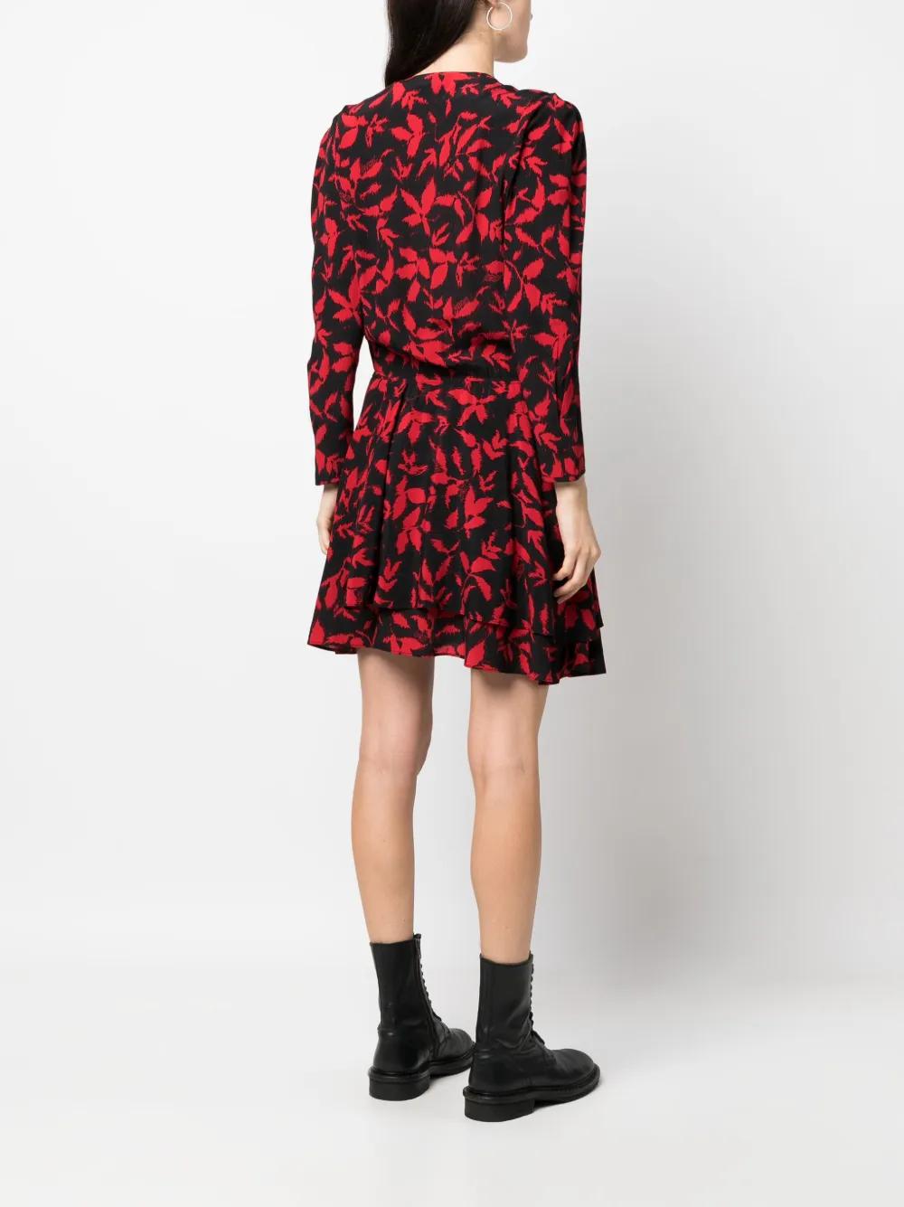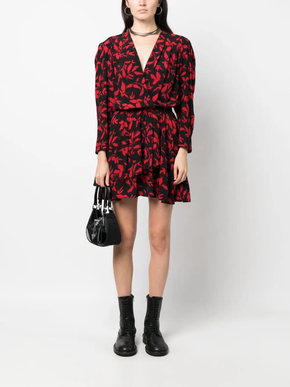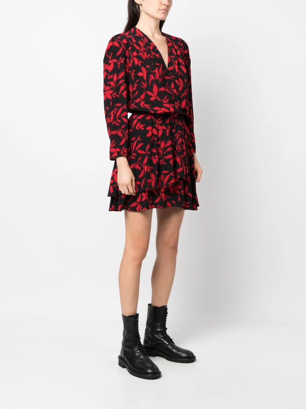 black/red leaf print two-tone design elasticated waistband layered details ruffled detailing V-neck long sleeves thigh-length