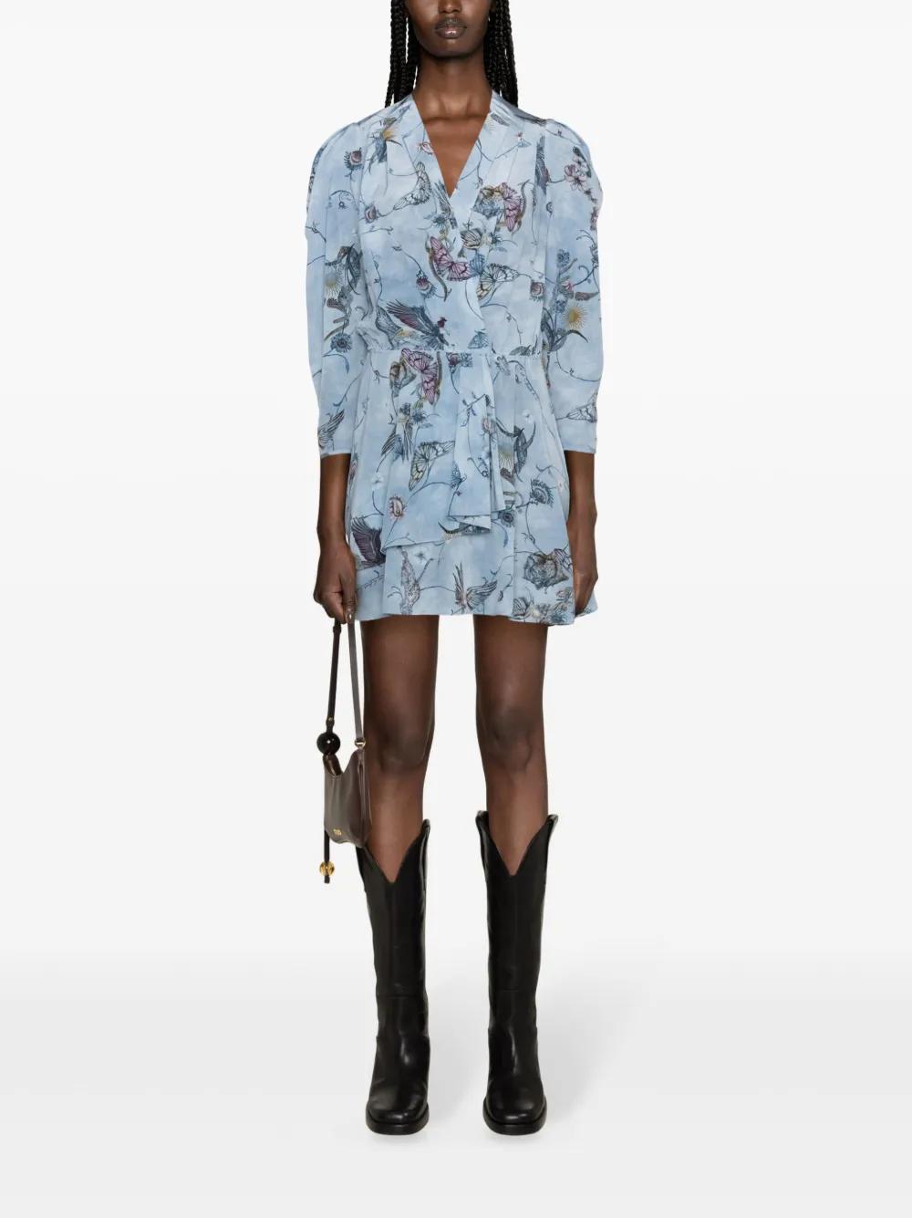 ice blue/multicolour silk crepe de chine botanical print V-neck long sleeves pleat detailing elasticated waistband draped detailing thigh-length unlined