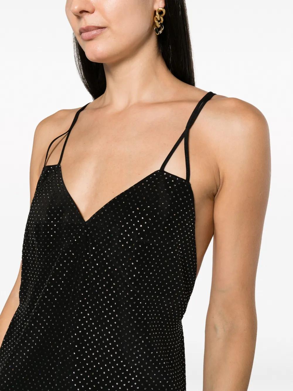 black silk rhinestone embellishment V-neck spaghetti straps rear criss-cross straps thigh-length straight hem