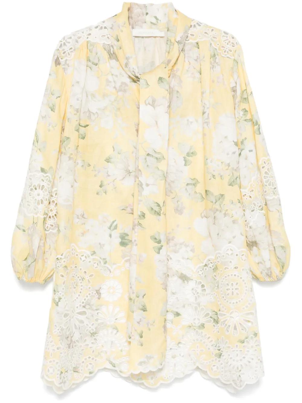 yellow/multicolour linen slub texture all-over floral print broderie anglaise pussy-bow collar scallop edge V-neck long puff sleeves elasticated cuffs pleat detailing to the rear detachable slip dress scallop hem thigh-length