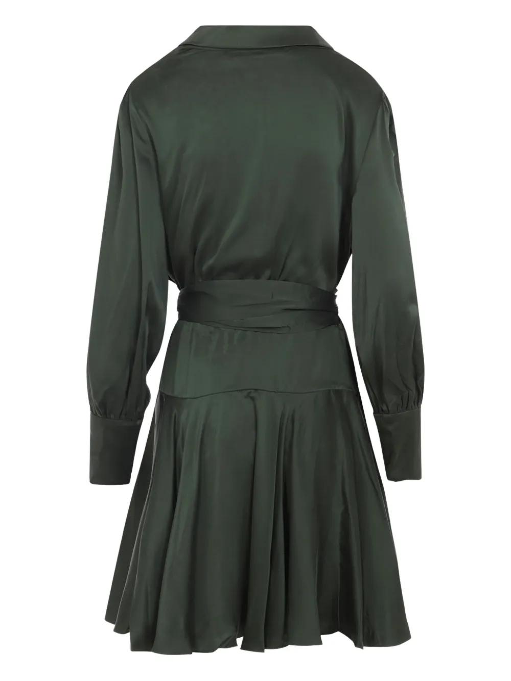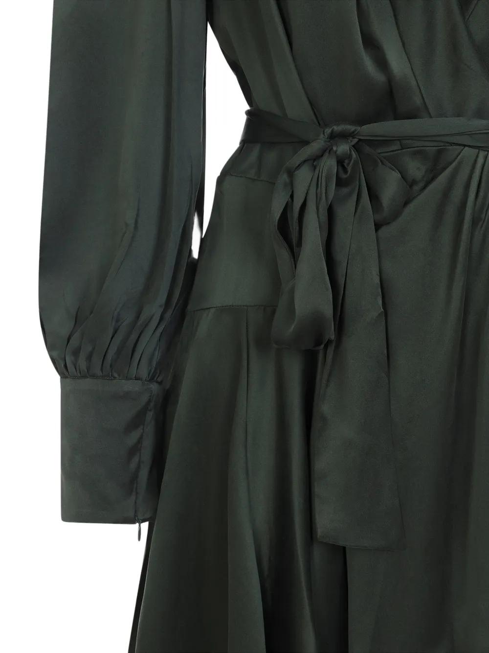 dark green silk wrap effect ruffled hem long sleeves v-neckline