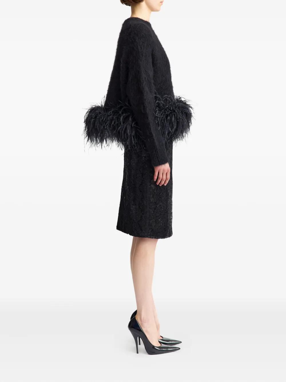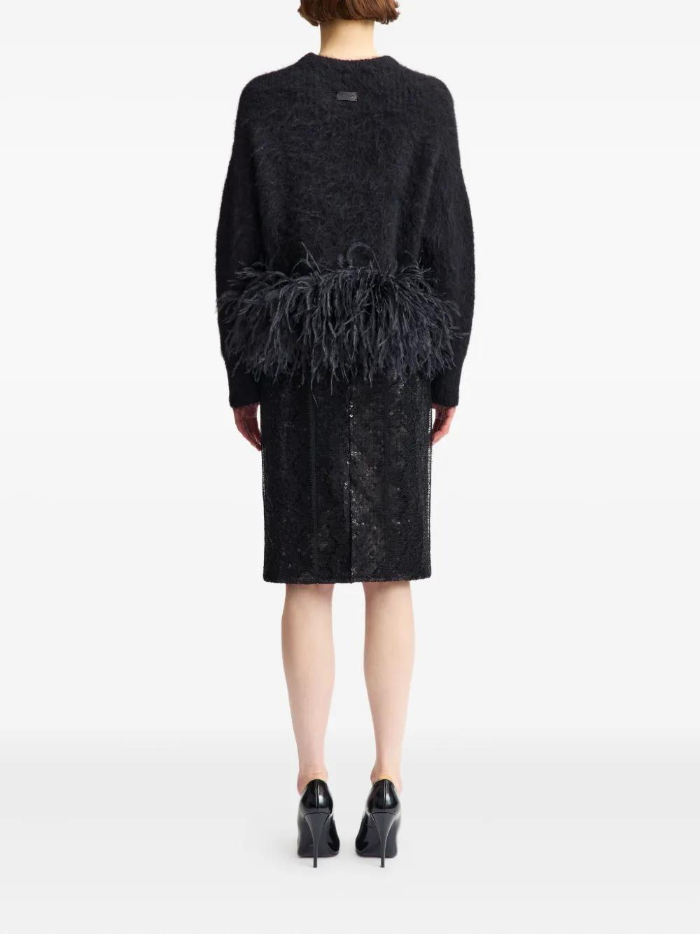 black feather trim knit construction round neck long sleeves ribbed cuffs