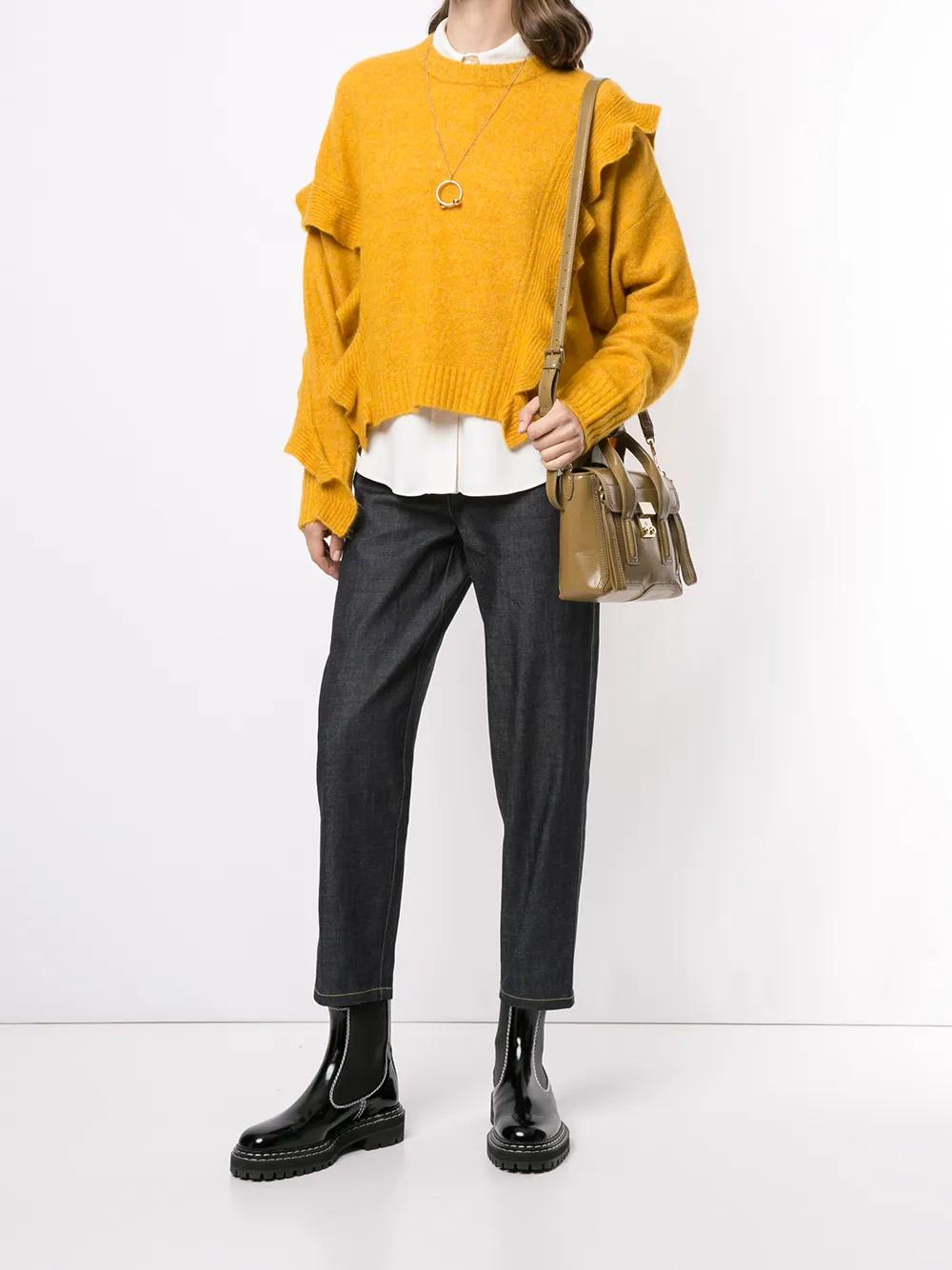 mustard yellow alpaca-blend round neck long sleeves ribbed cuffs ruffled detailing ribbed hem cropped