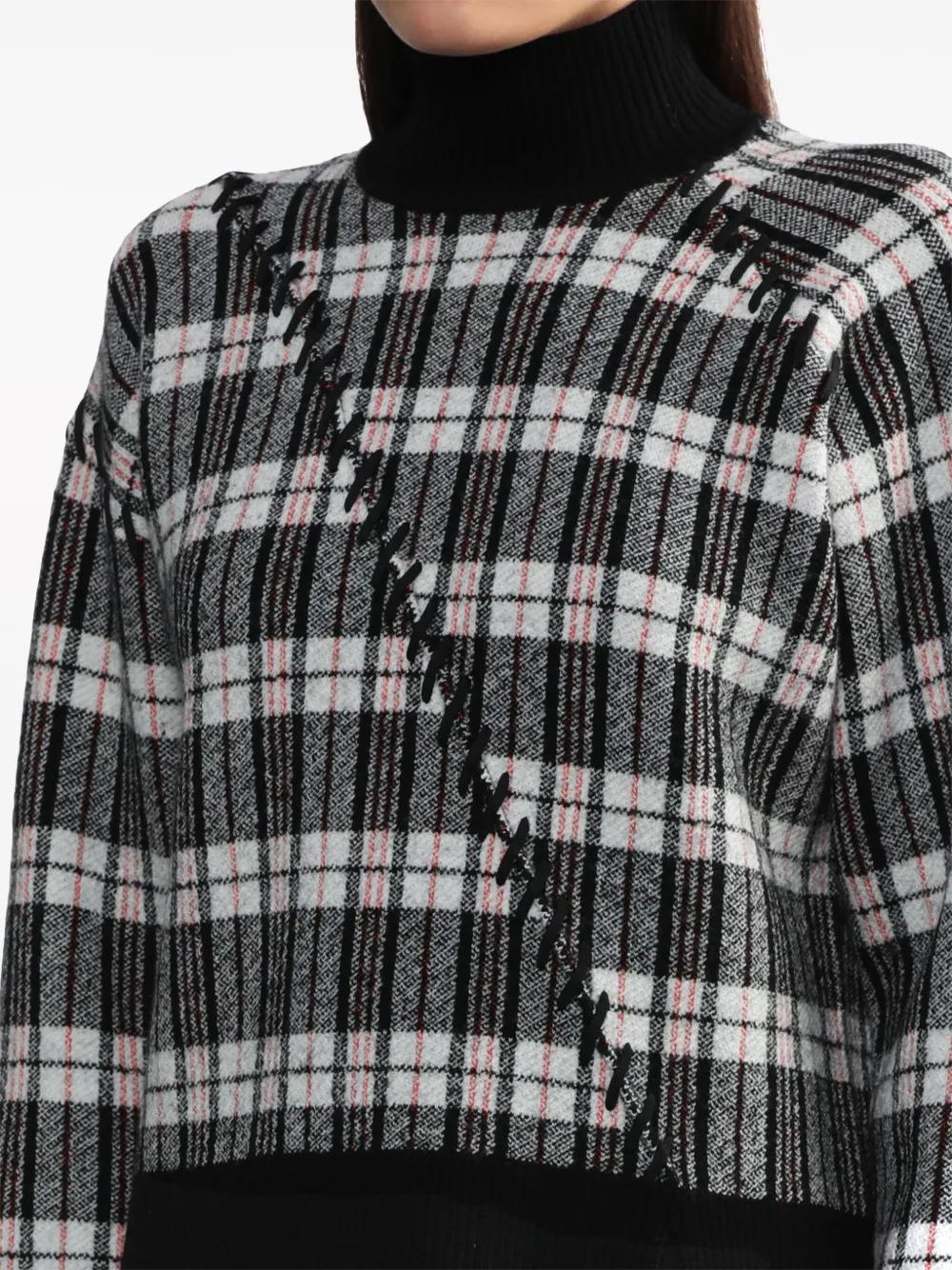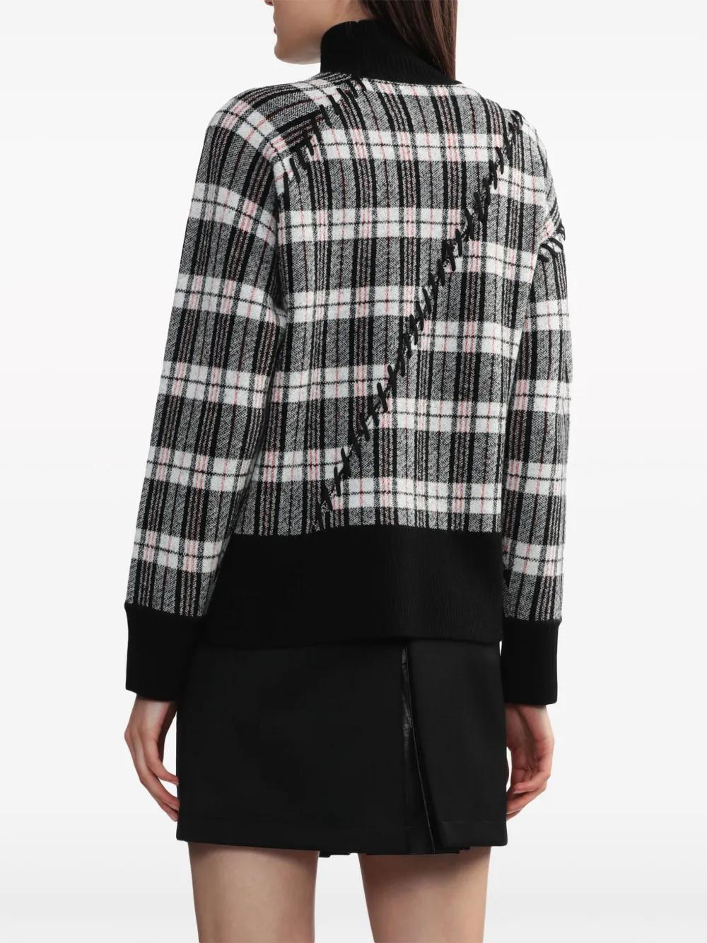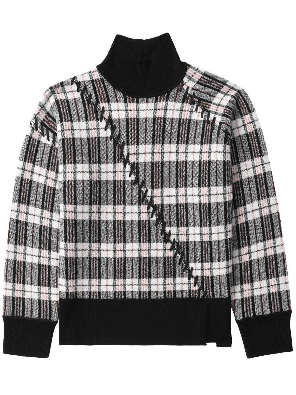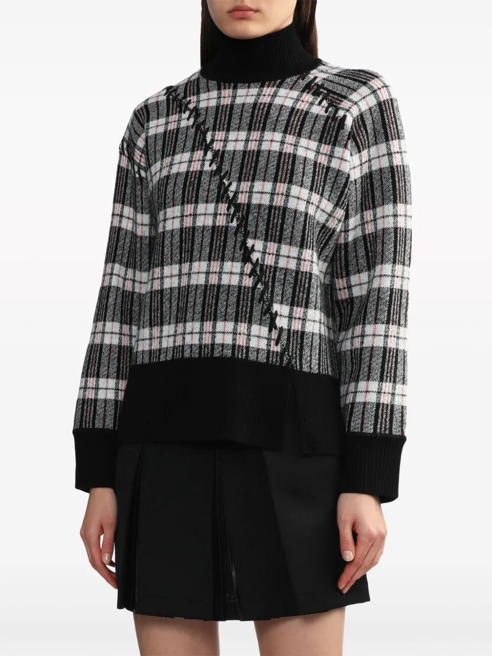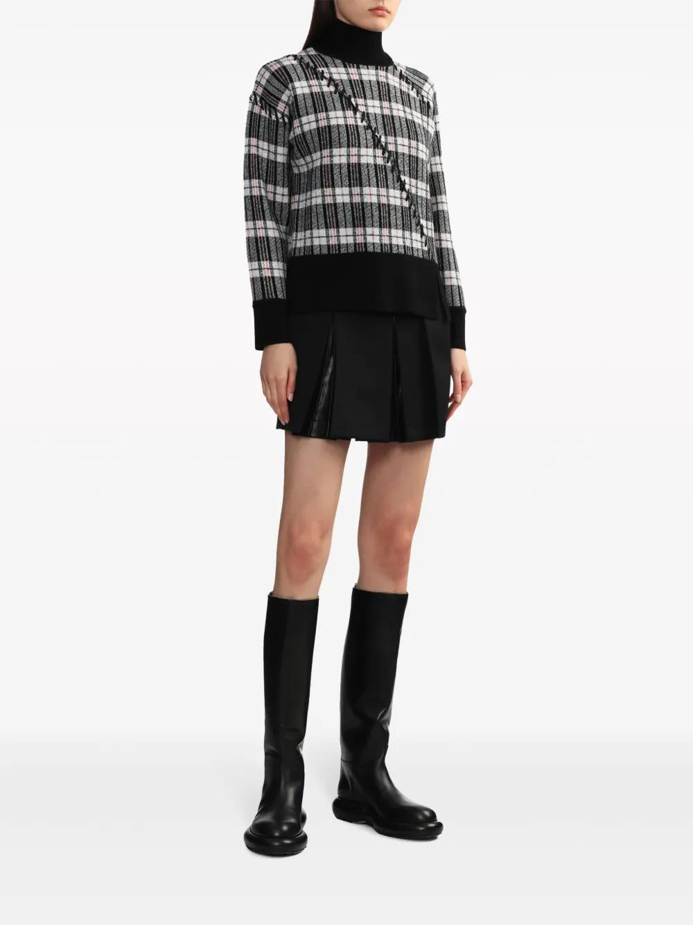 black/multicolour merino wool jacquard plaid check pattern decorative stitching high neck drop shoulder long sleeves side slit ribbed cuffs and hem