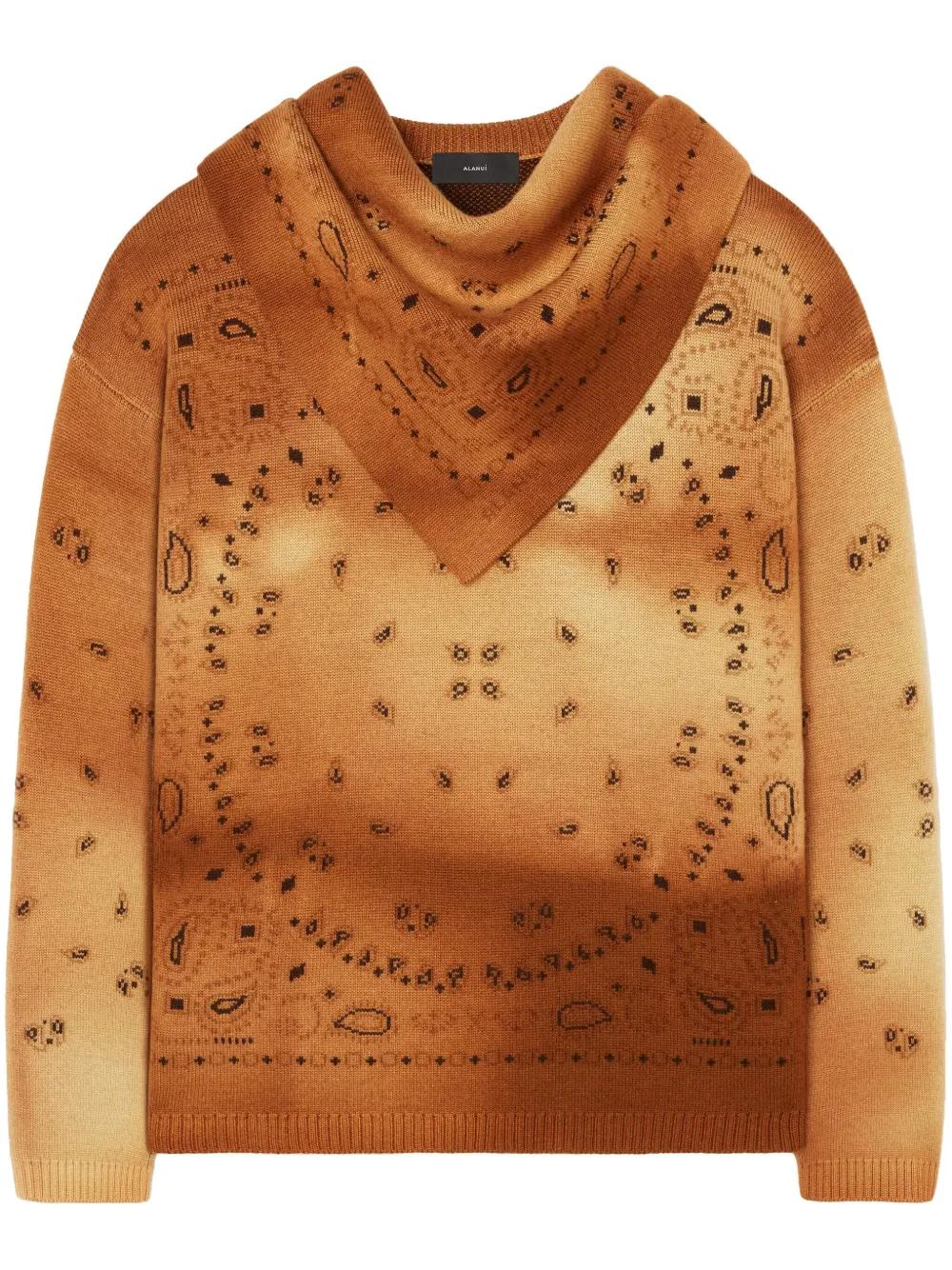 sand brown/multicolor virgin wool bandana print cowl neck straight hem long sleeves