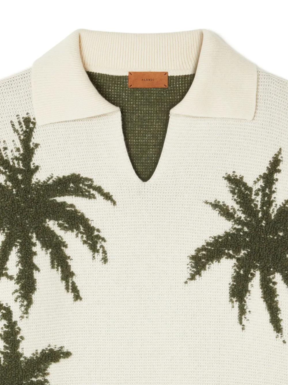 ivory olive palm-tree pattern polo neck long sleeves textured knit
