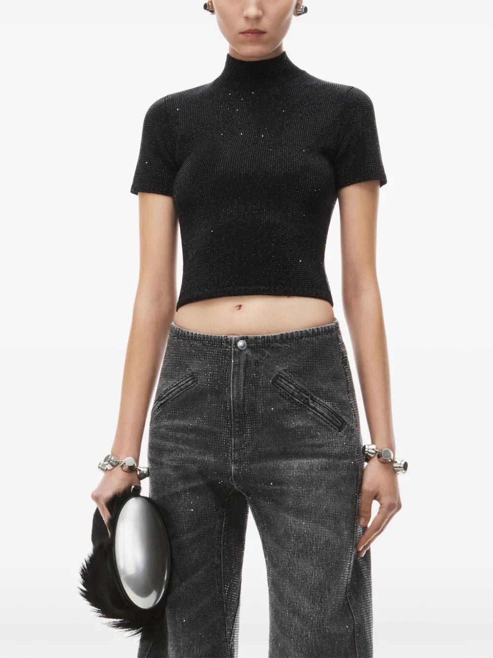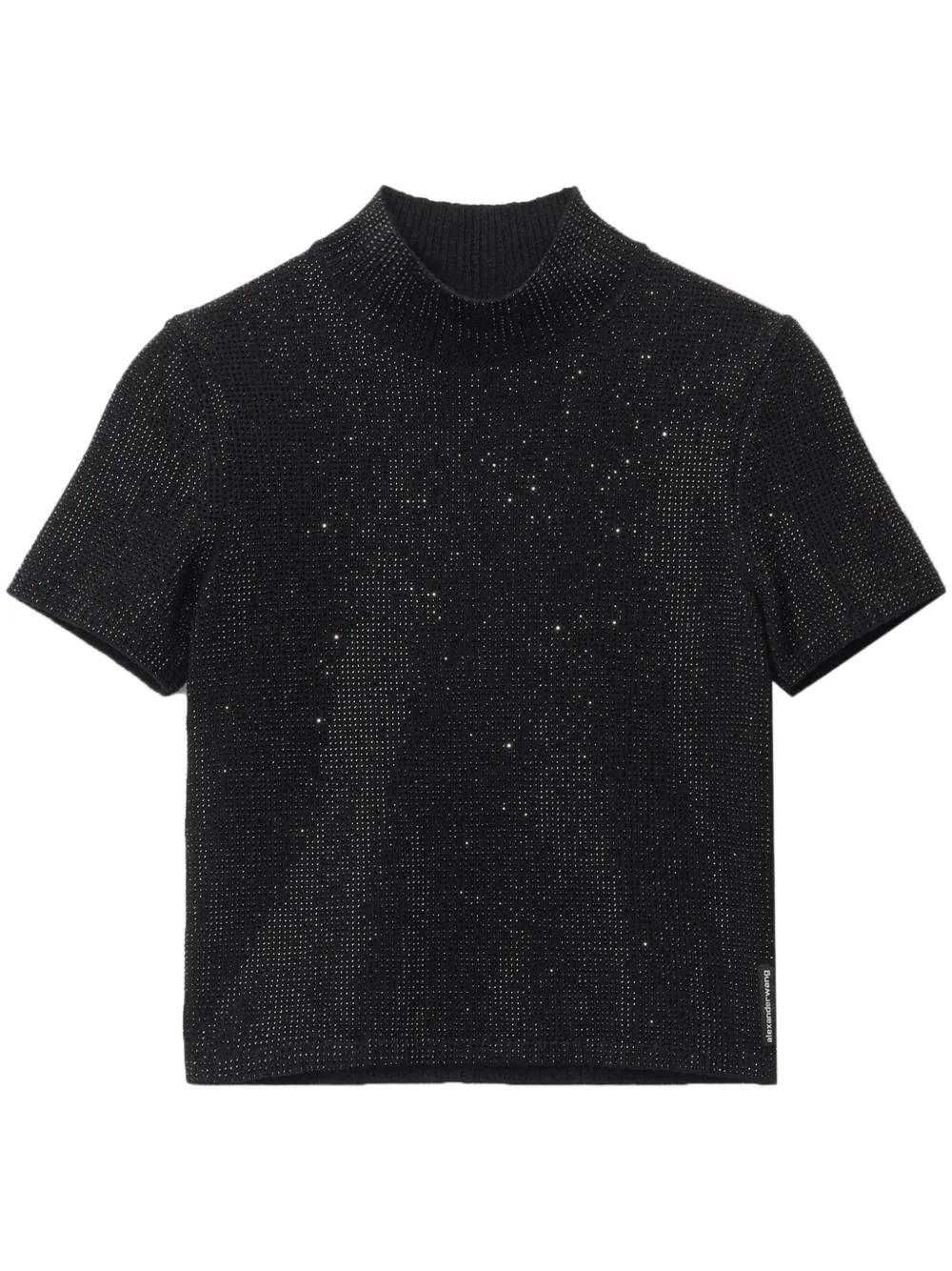 black wool blend crystal embellishment mock neck short sleeves straight hem