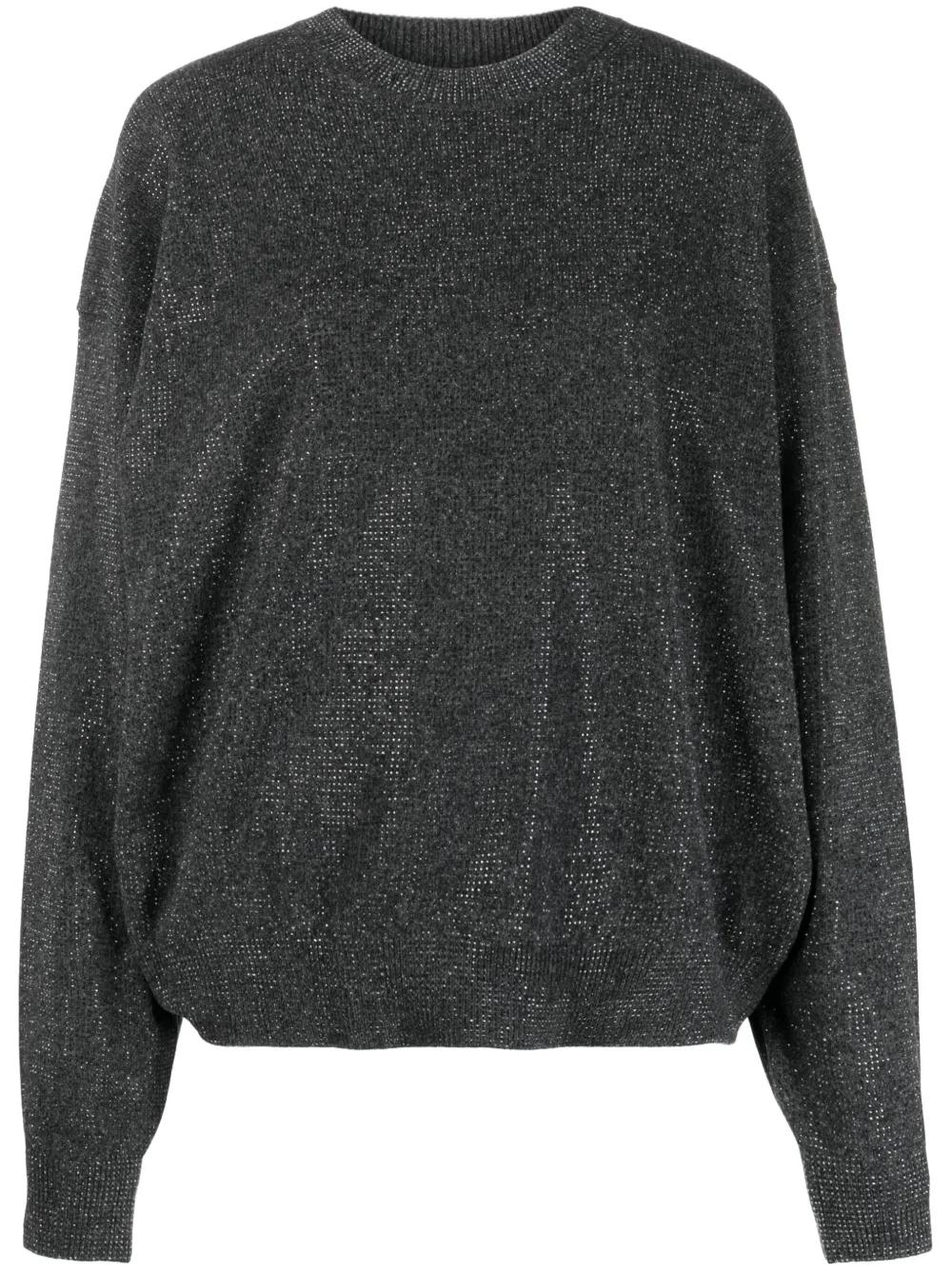 charcoal grey wool-cashmere blend rhinestone embellishment rhinestone logo detail crew neck drop shoulder long sleeves ribbed cuffs and hem