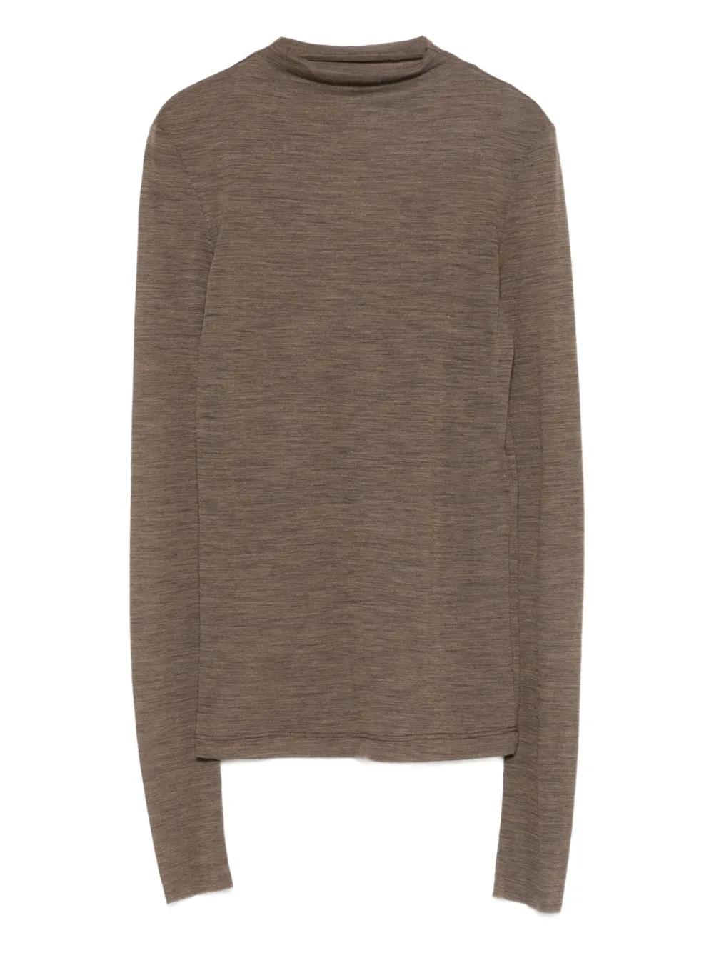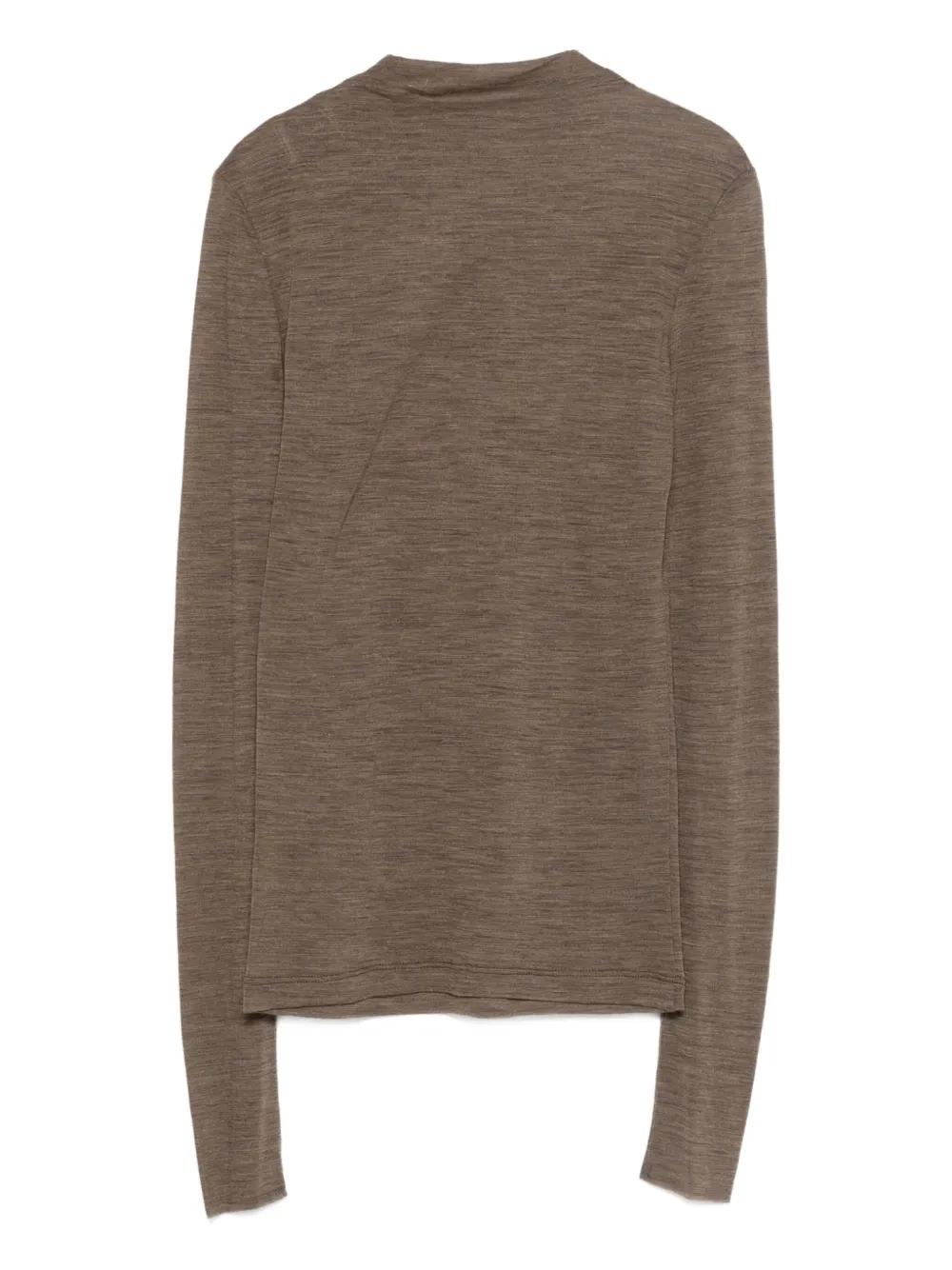 brown wool long sleeves mock neck semi-sheer construction