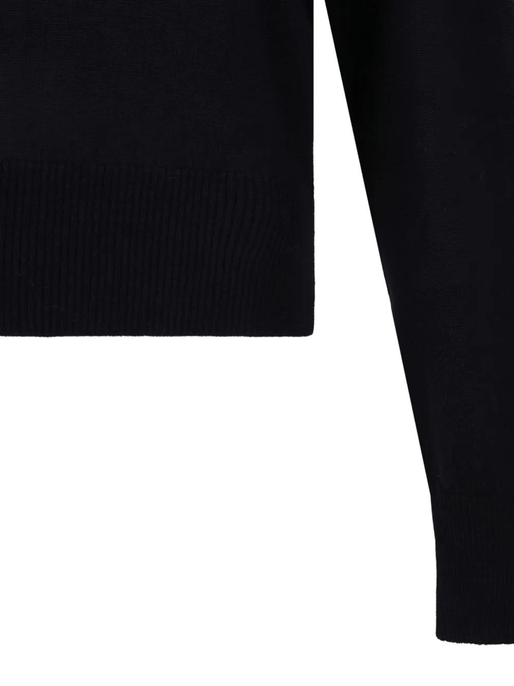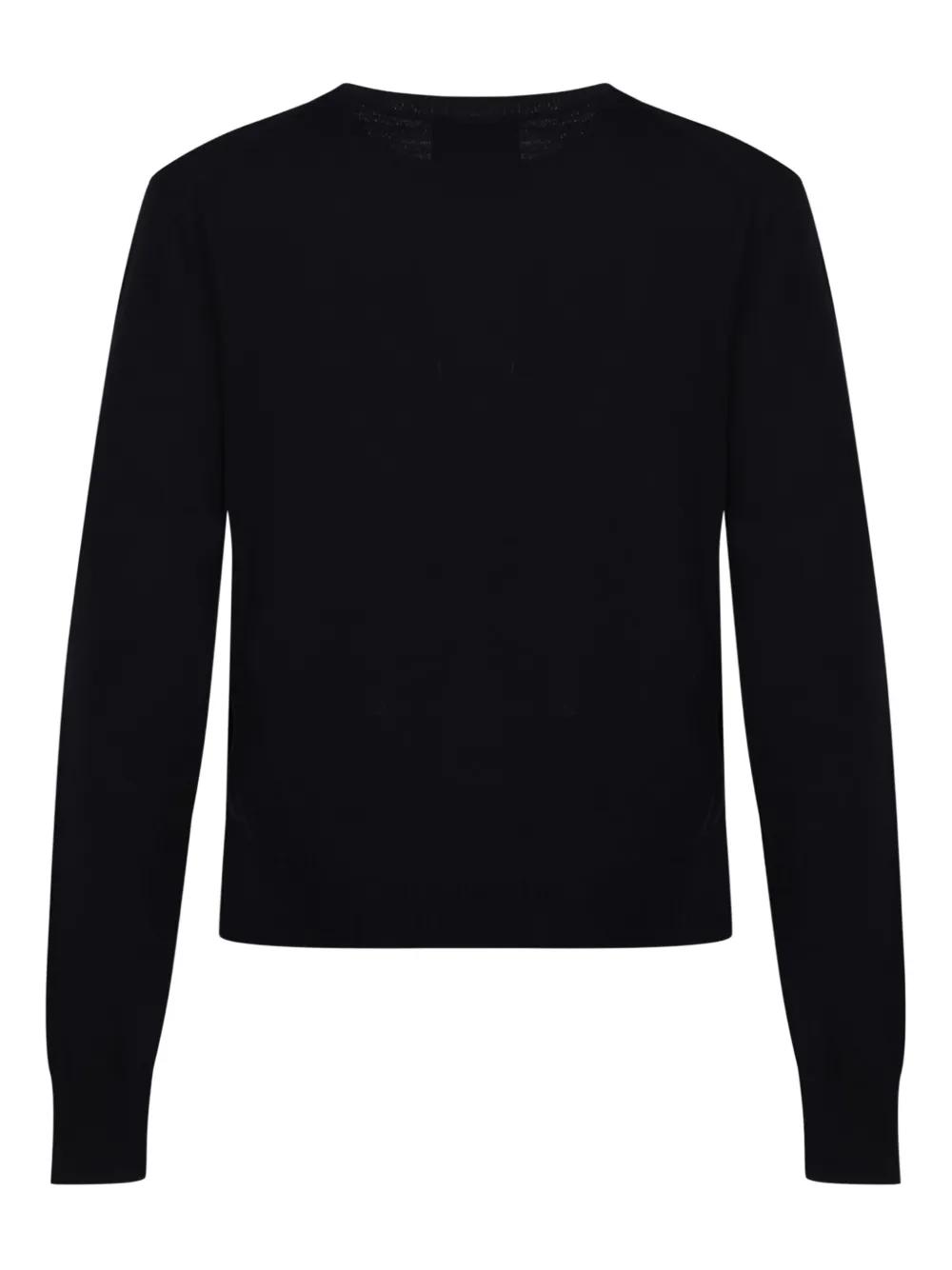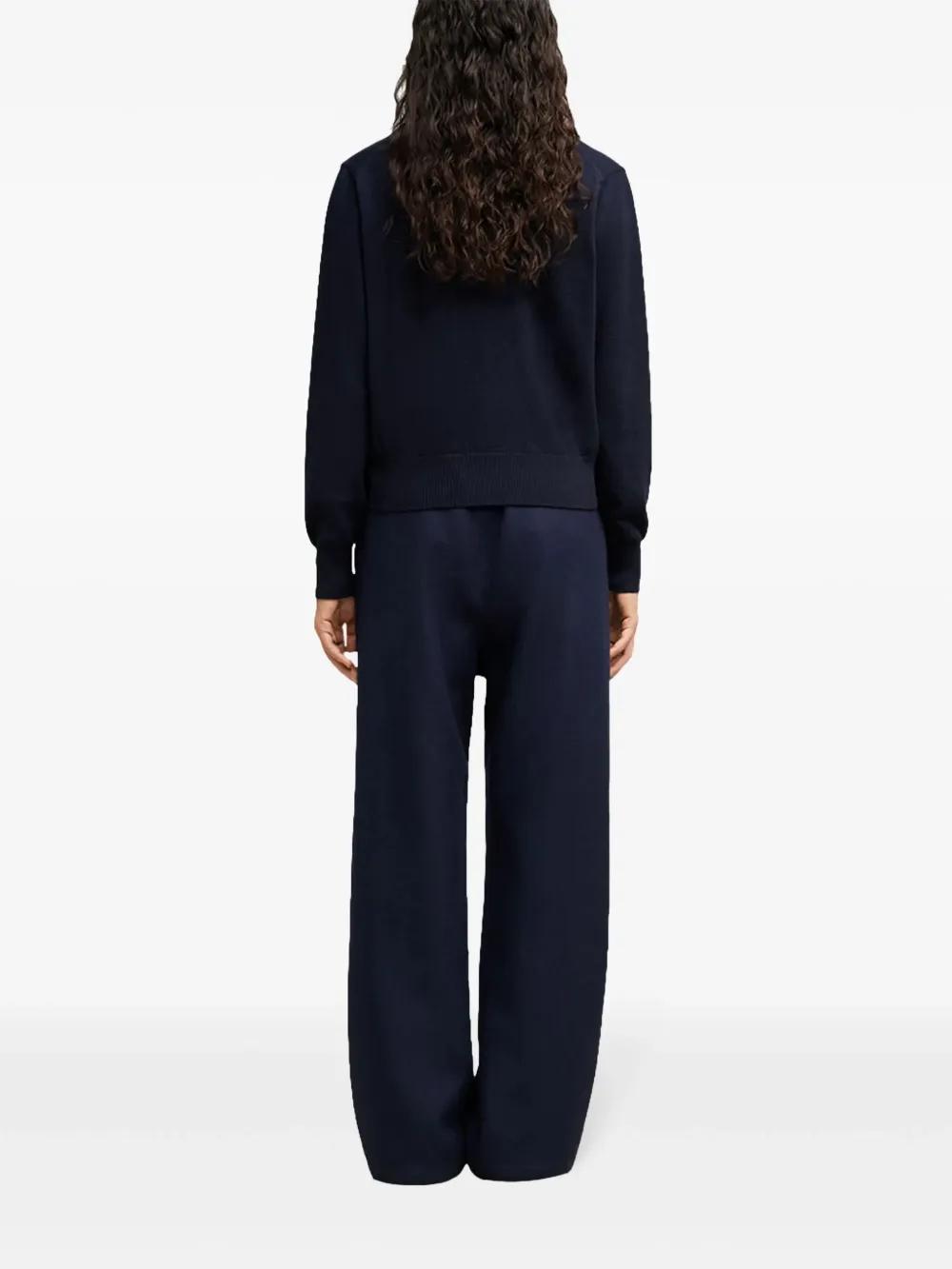 midnight blue merino wool knitted construction fine knit embroidered logo at the chest crew neck long sleeves ribbed cuffs and hem