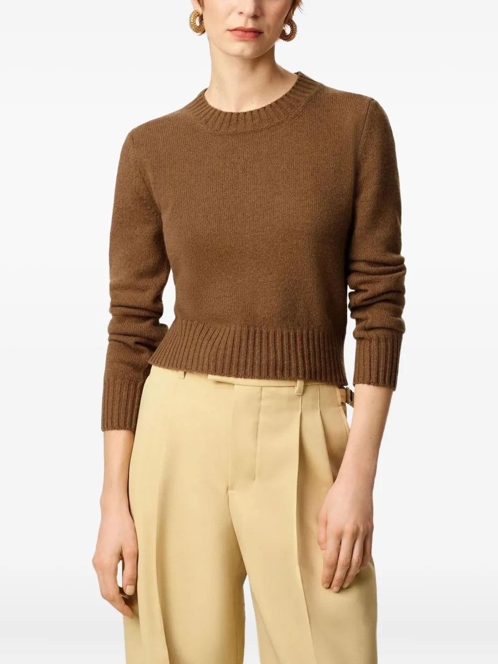 brown crew neck long sleeves ribbed hem cropped length logo detail