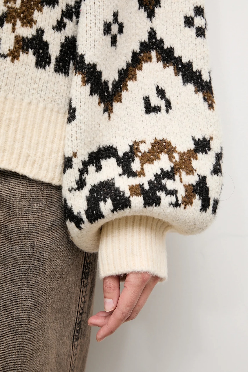 - Luźny krój zapewniający pełną swobodę ruchów. - Obniżona linia ramion. - Okrągły dekolt. - Wzorzysta dzianina. - Długość rękawa(mierzona od dekoltu): 75 cm. - Długość: 61 cm. - Szerokość pod pachami: 57 cm. - Wymiary podane dla rozmiaru: S/M.