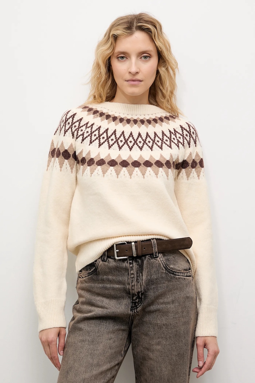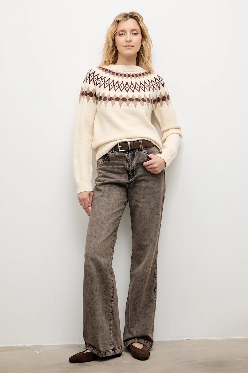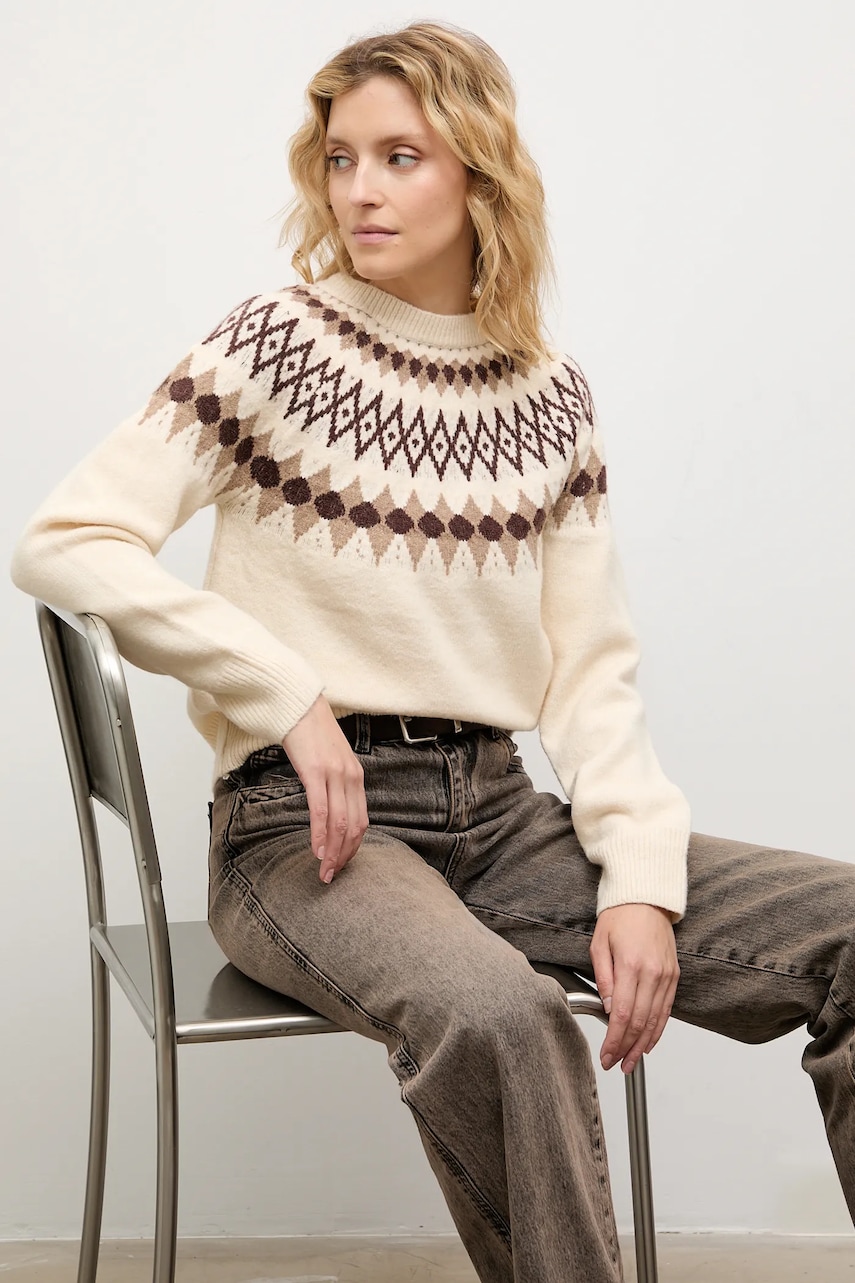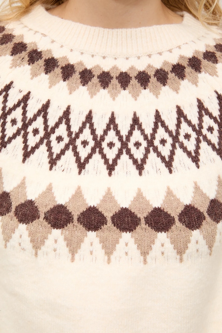 - Sweter w fasonie regular zapewnia wygodę i uniwersalny wygląd. Delikatnie dopasowuje się do sylwetki, ale nie podkreśla jej nadmiernie. Klasyczny i prosty, sprawdzi się zarówno w eleganckich, jak i casualowych stylizacjach. - Okrągły, prążkowany dekolt. - Wzorzysta dzianina. - Rękaw raglanowy, dzięki swojej konstrukcji, zapewnia większą swobodę ruchu. - Długość rękawa(mierzona od dekoltu): 68 cm. - Długość: 60 cm. - Szerokość pod pachami: 46 cm. - Wymiary podane dla rozmiaru: S/M.