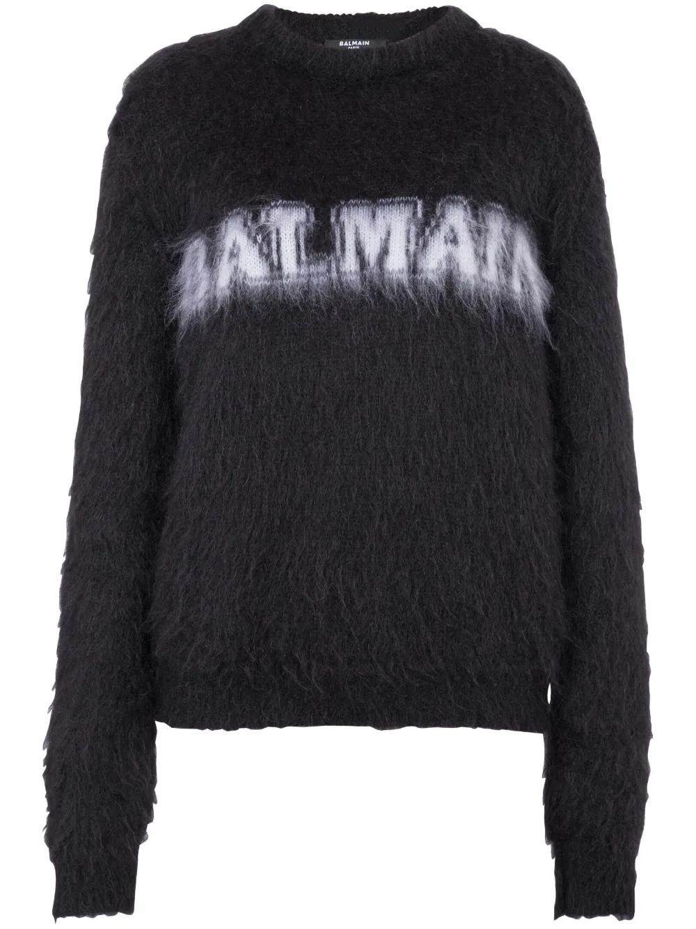 black mohair blend jacquard logo motif round neck long sleeves straight hem ribbed trim