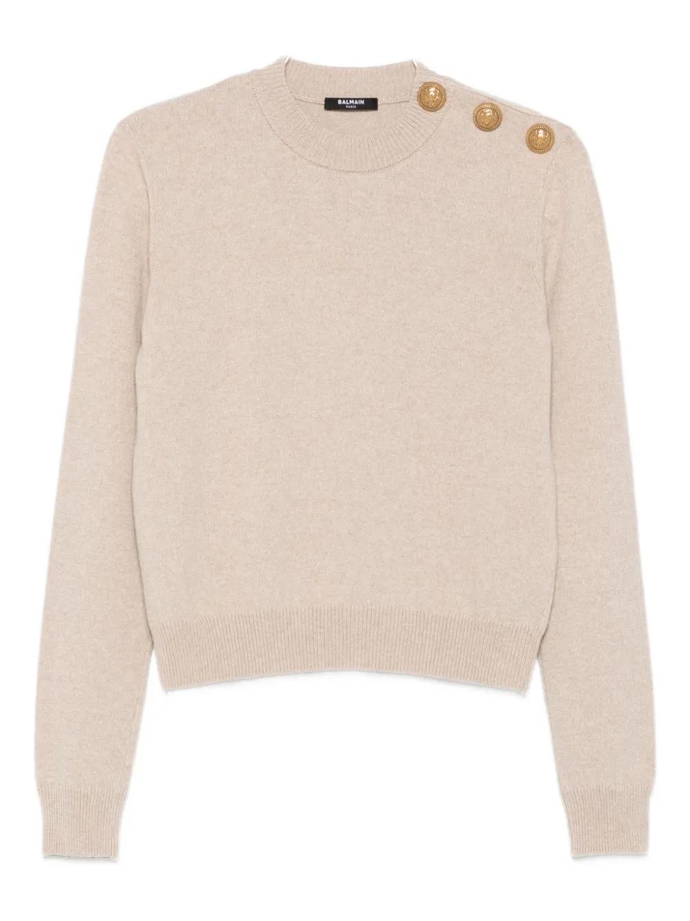 sand beige round neck shoulder buttons long sleeves ribbed cuffs