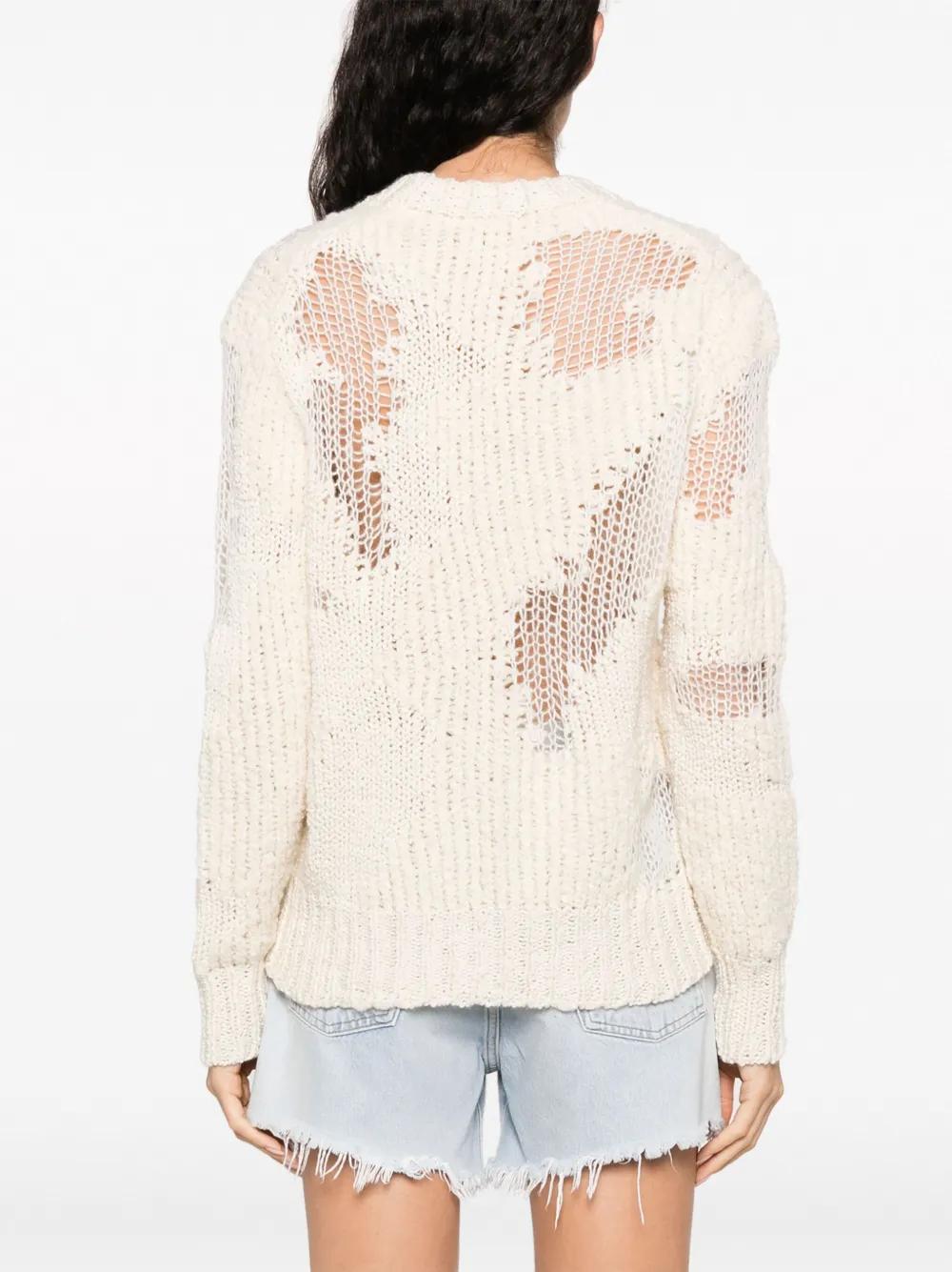 milk white wool-cashmere blend chunky ribbed knit mesh detailing distressed effect semi-sheer panels crew neck long sleeves ribbed cuffs and hem