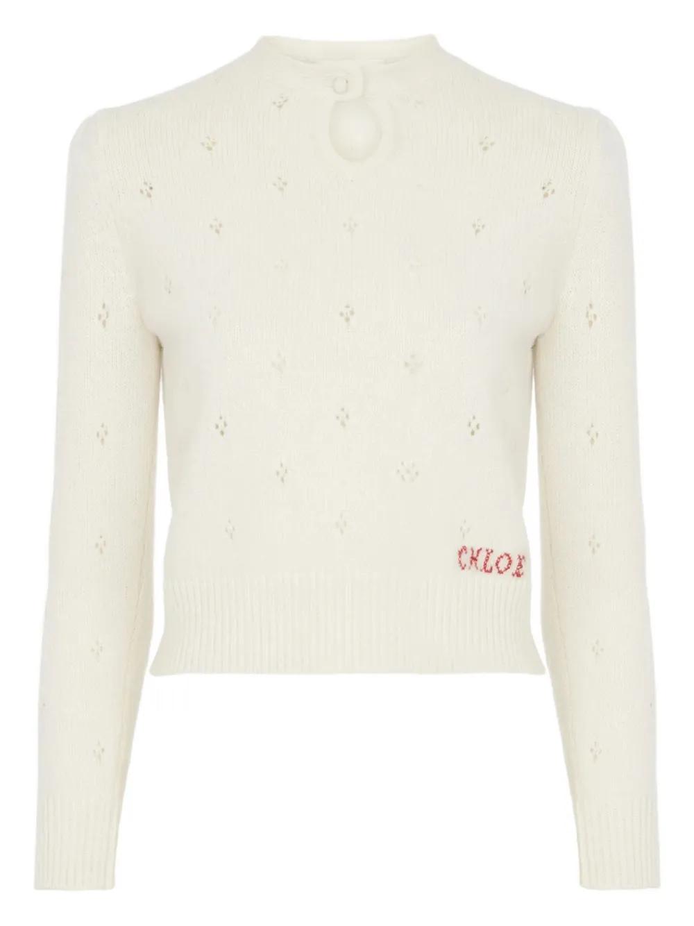 white Pointelle knit embroidered detail keyhole neckline long sleeves ribbed hem