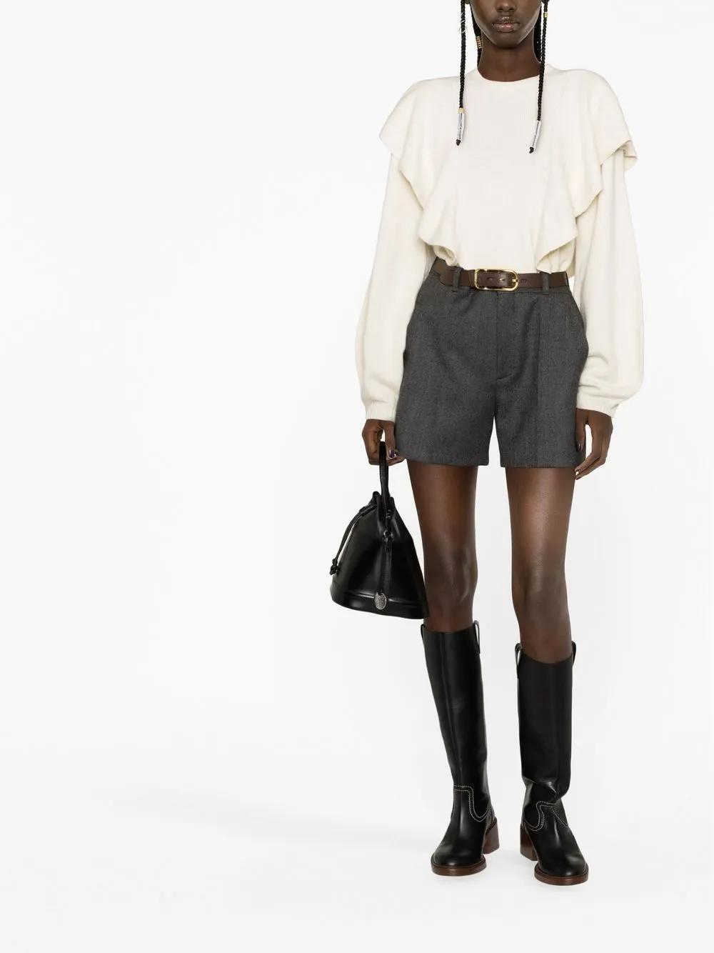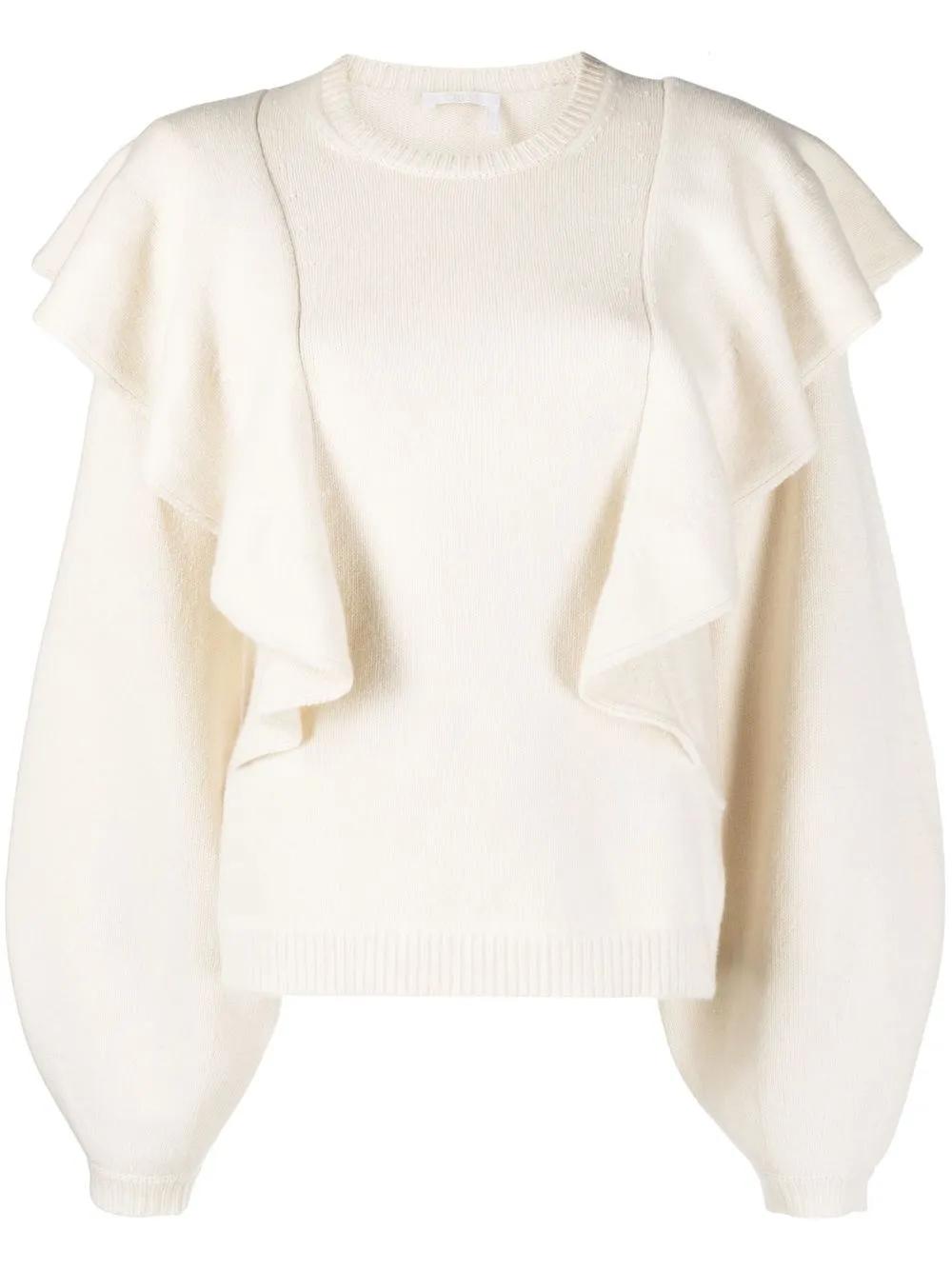 cream white cashmere ruffled detailing round neck long sleeves ribbed hem