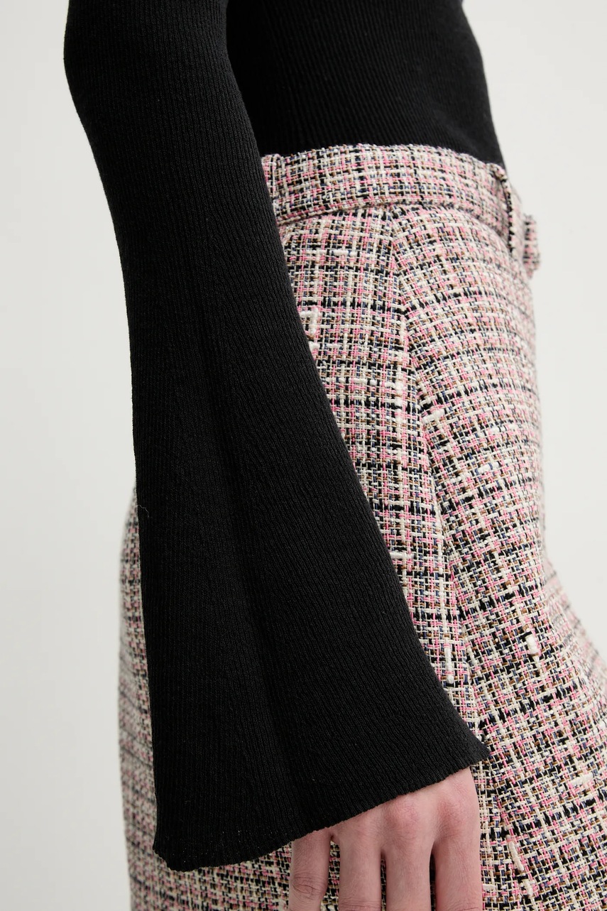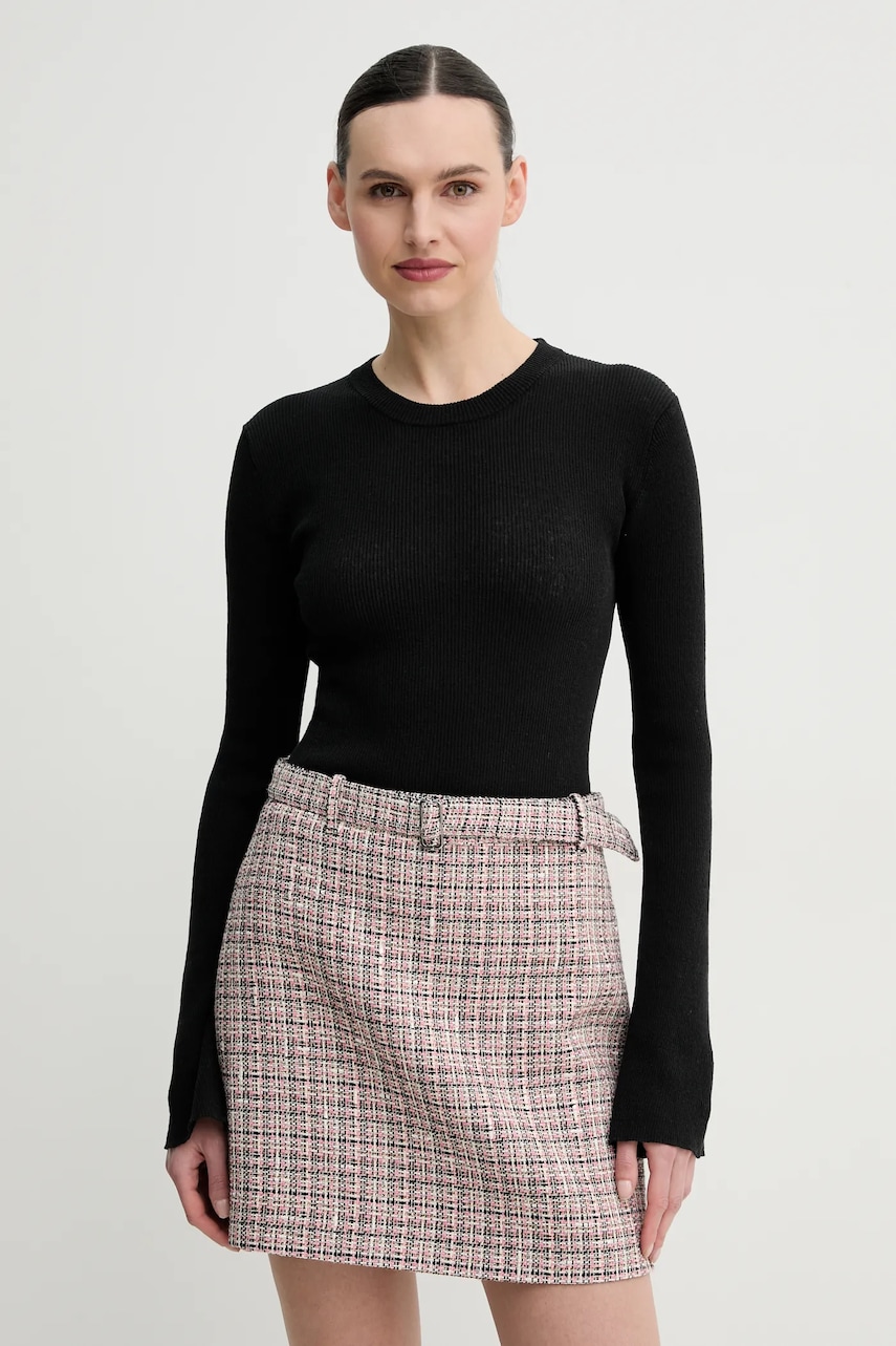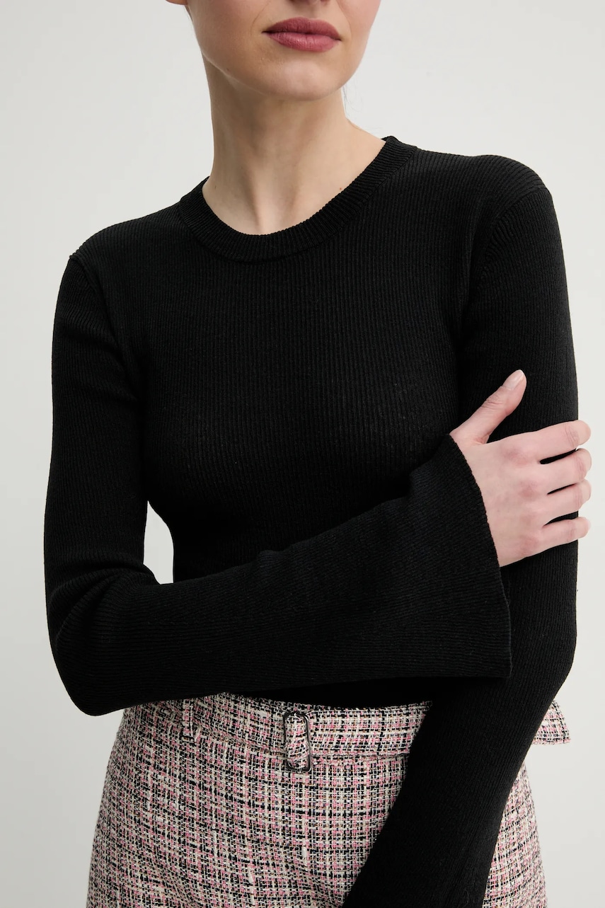 - Dopasowany, podkreślający sylwetkę fason. - Okrągły, prążkowany dekolt. - Długi, rozszerzany rękaw. - Prążkowana struktura materiału sprawia, że jest on niezwykle elastyczny i doskonale przylega do ciała. - Cienka, elastyczna dzianina.