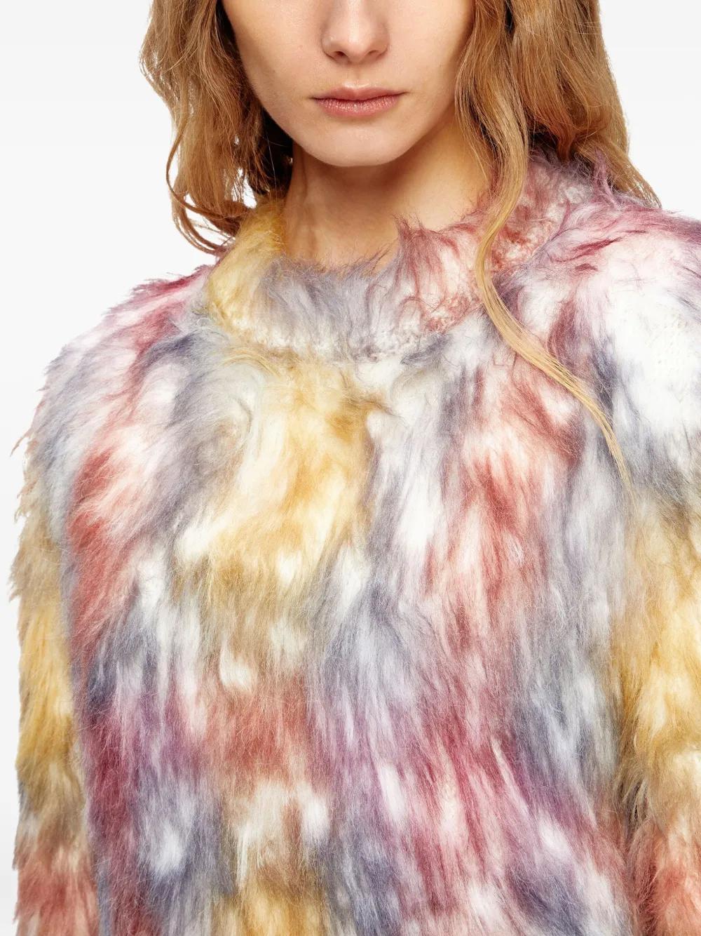 beige jacquard knit long sleeves round neck fluffy texture check pattern