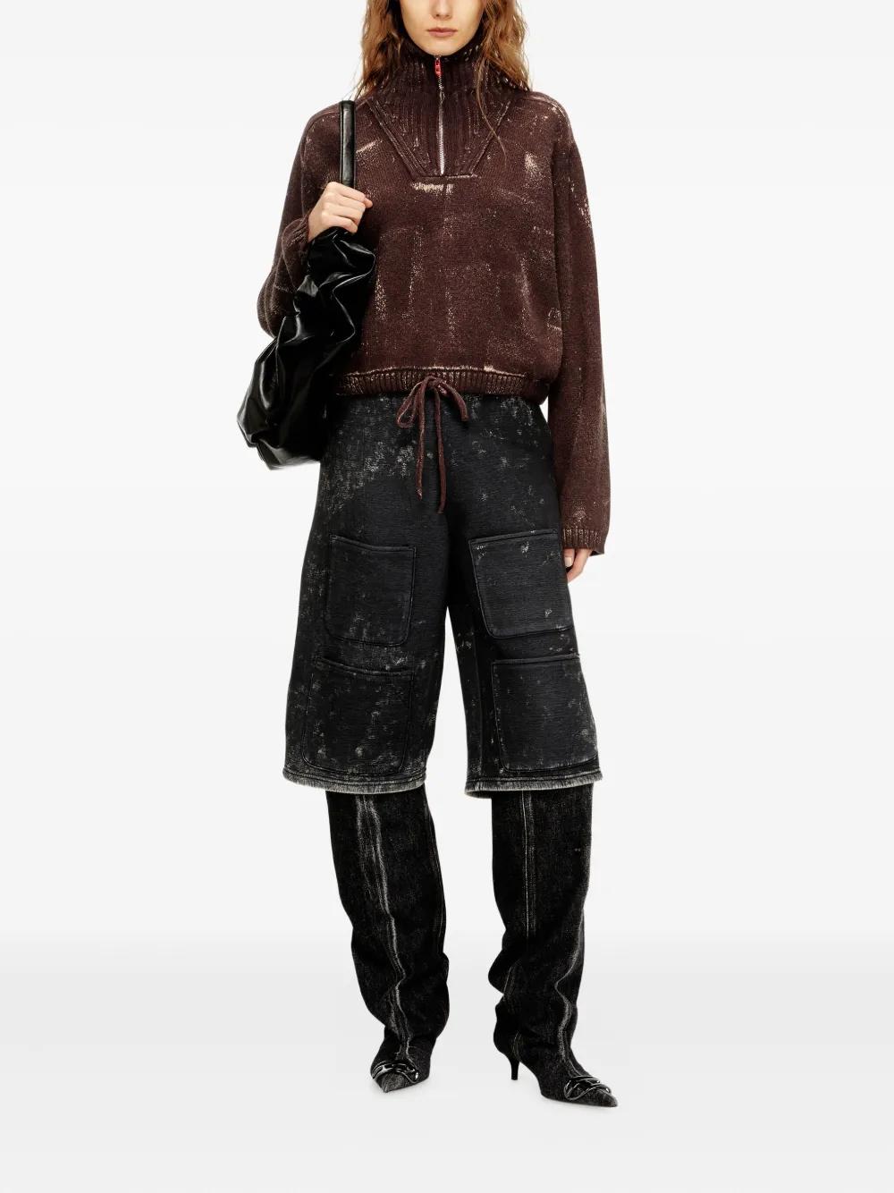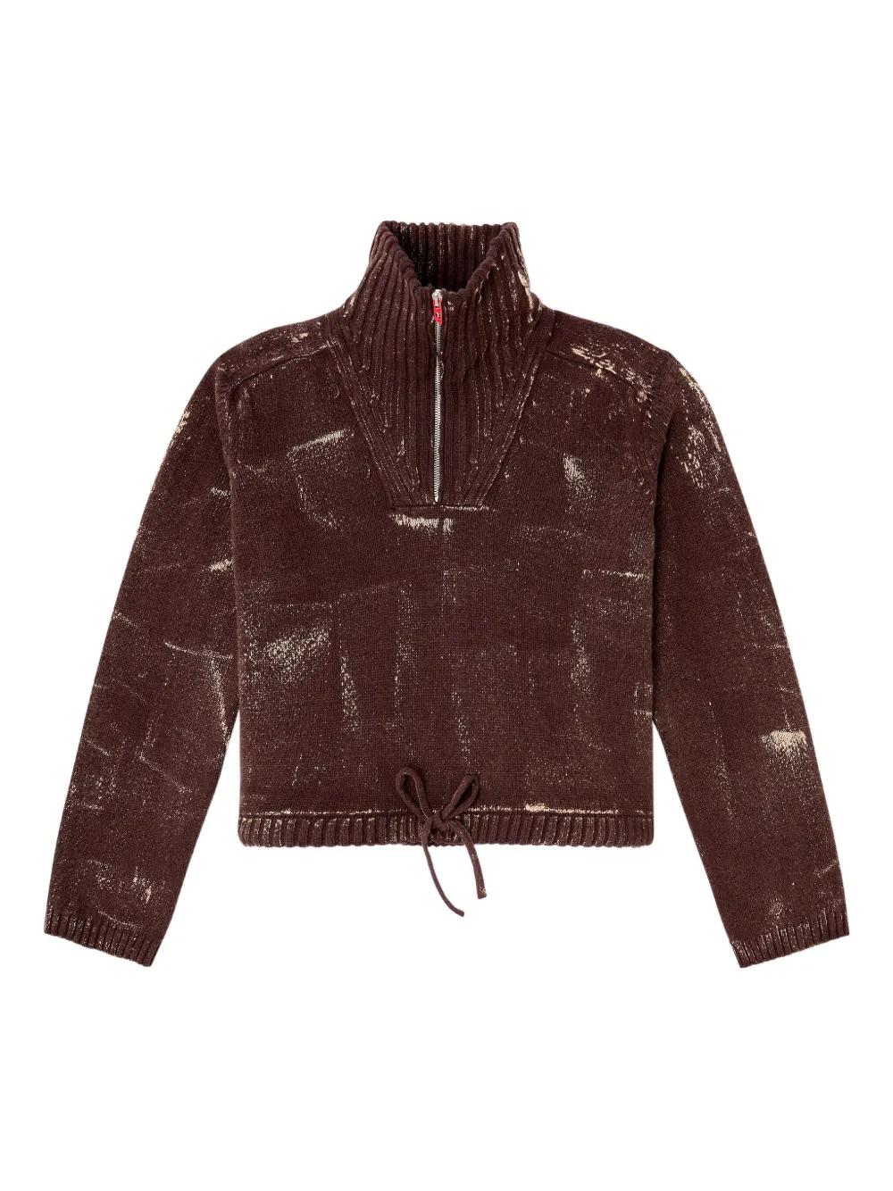 brown brushed effect d-shaped zip pull drawstring hem high neck knitted